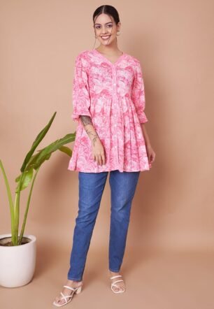 FABRIC FITOOR Womens Jaipuri Pure Cotton Pink Color Tiered Fit & Flared Casual Top (Size-S)
