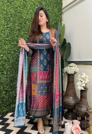 GoSriKi Women’s Rayon Viscose Printed Straight Kurta with Pant & Dupatta (Sula Multi-GS_L_Multicolor_Large)