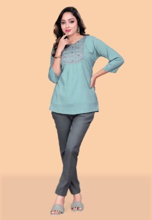 SHANTVAN GALLERY Tunics for Women – Stylish & Comfortable Indian Kurti Top with 3/4 Designer Sleeves | Delta Poly Short Tunics for Ladies | Casual (in, Alpha, S, Sea Green)