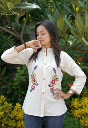 RIEKA Women?s Cream White Embroidered Cotton Shirt with Floral Thread Work Mandarin Collar Button Down Relaxed Fit Casual Top (Cream-M)