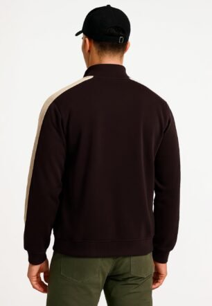Jump Cuts Mens Printed Sleeve Tape Polo Neck Full Sleeve Brown and Beige Fleece Jacket