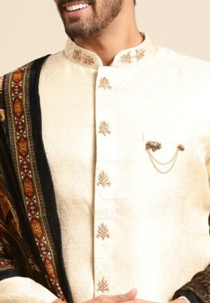 KISAH Sherwani Set with Dupatta for Men – Textured Silk Blend Jacquard Sherwani, Churidar & Dupatta | Traditional Indian Outfit for Weddings, Receptions & Festivals, White, 42