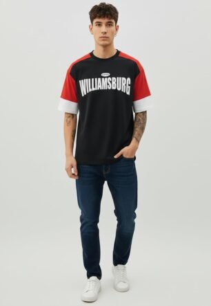 LEOTUDE Men’s Half Sleeve Cottonblend Printed Colourblocked Round Neck Drop Shoulder Oversized Tshirt for Man (FS49_BLK_Williamsburg_C1_P_Red_3XL)