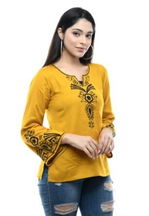 MAAHI Women’s Rayon Mustard Embroidery Top Sleve 3/4 Size- M