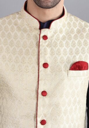 Modern Garments Blended ZORAVO Men NAVY BLUE Solid Kurta Set & Matching Chudidar with Maroon Jacket Waistcoat (46, Blue Kurta Gold Pajama Golden Jacket)