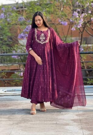 RIYA ATELIER BY RIYANSHI Women’s Cotton Embroidery Anarkali Kurti and Pant with Dupatta Set (Purple-M)