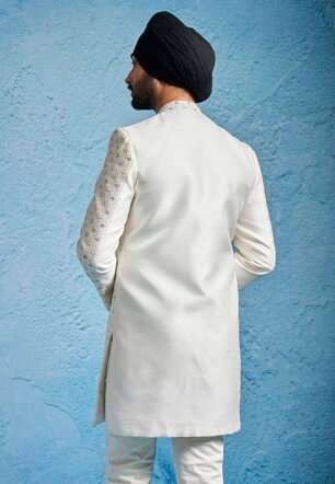 VASTRAMAY Men’s Cream Silk Blend Sherwani Only Top – Silk Blend Embroidered Sequiend Indo Western