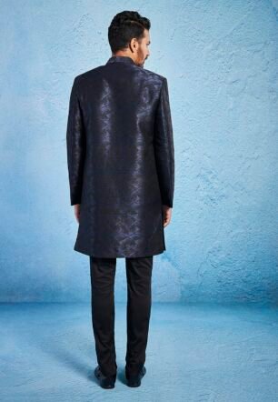 VASTRAMAY Men’s Navy Blue Silk Blend Sherwani Only Top – Silk Blend Jacquard Indo Western