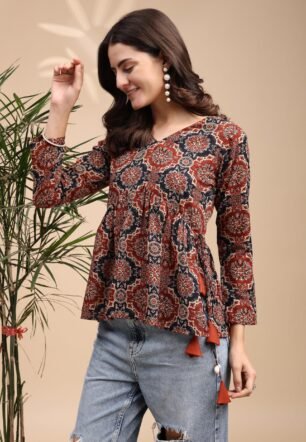 Youthnic Women’s Cotton Blend Bandhani Print Peplum Top with Tassles and Kodi (Rust(