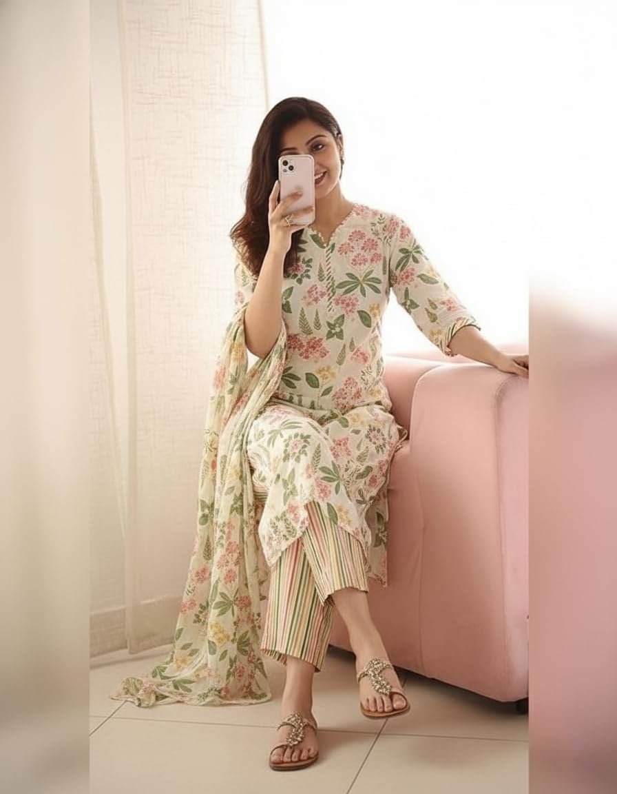 ANNI DESIGNER Women’s Cotton Blend Printed Straight Kurta with Pant & Dupatta (Kumud Cream_L_Cream_Large)