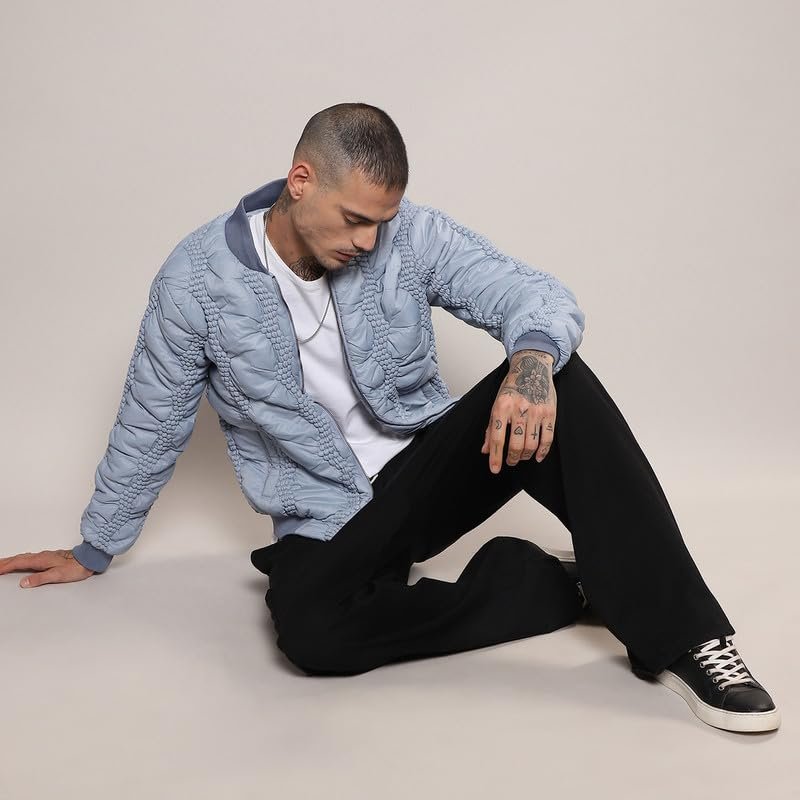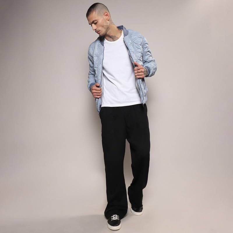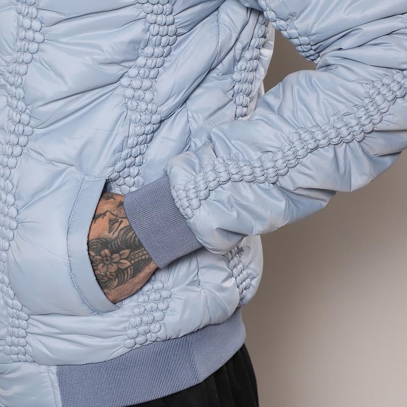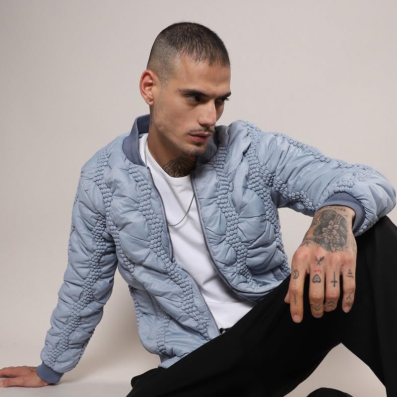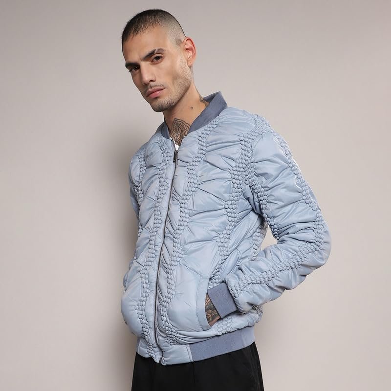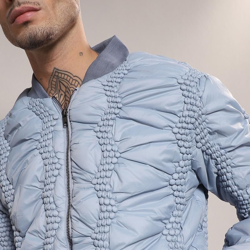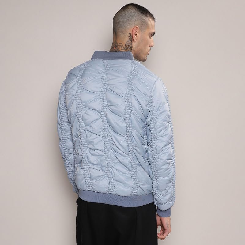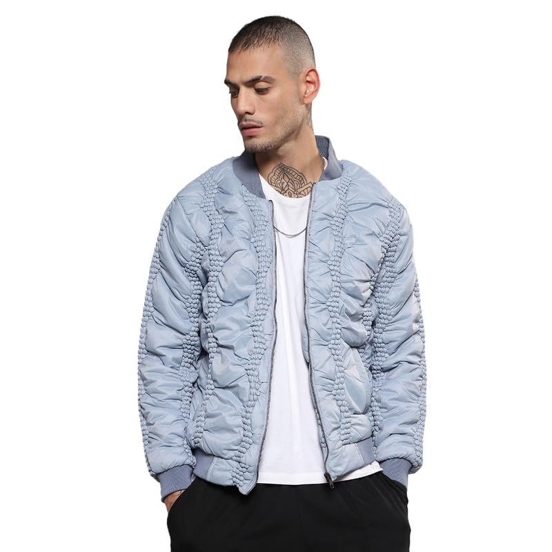 Campus Sutra Men’s Icy Blue Braided Crease Puffer Jacket For Casual Wear | Baseball Collar | Long Sleeve | Zipper Closure | Jacket Crafted With Comfort Fit For Everyday Wear