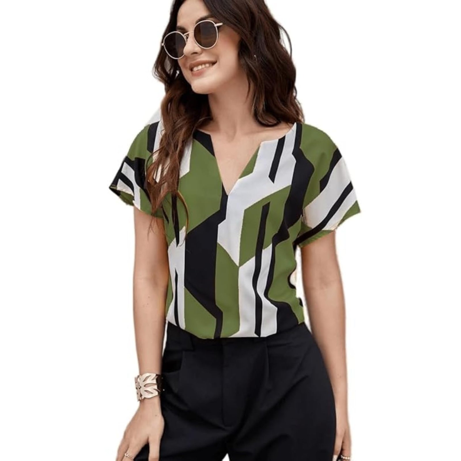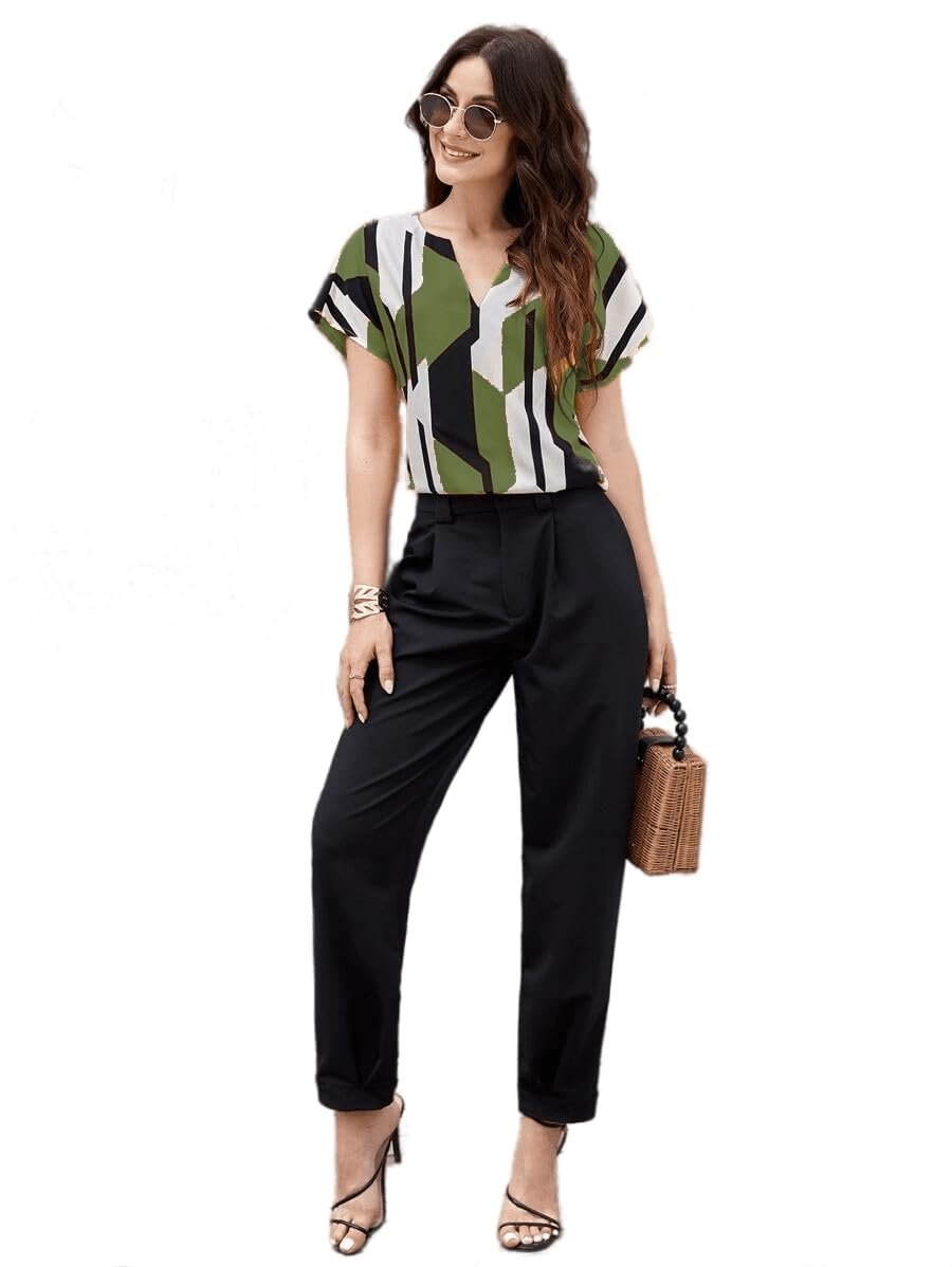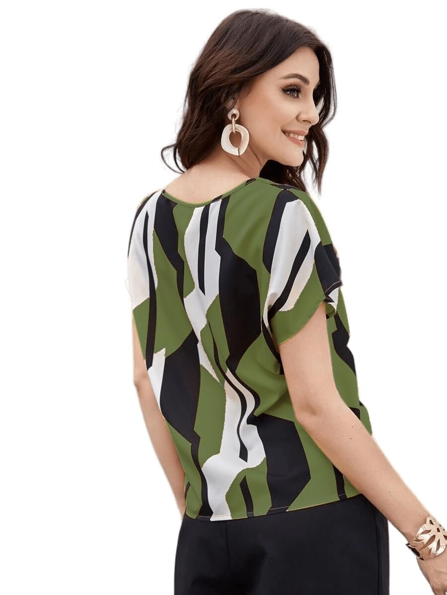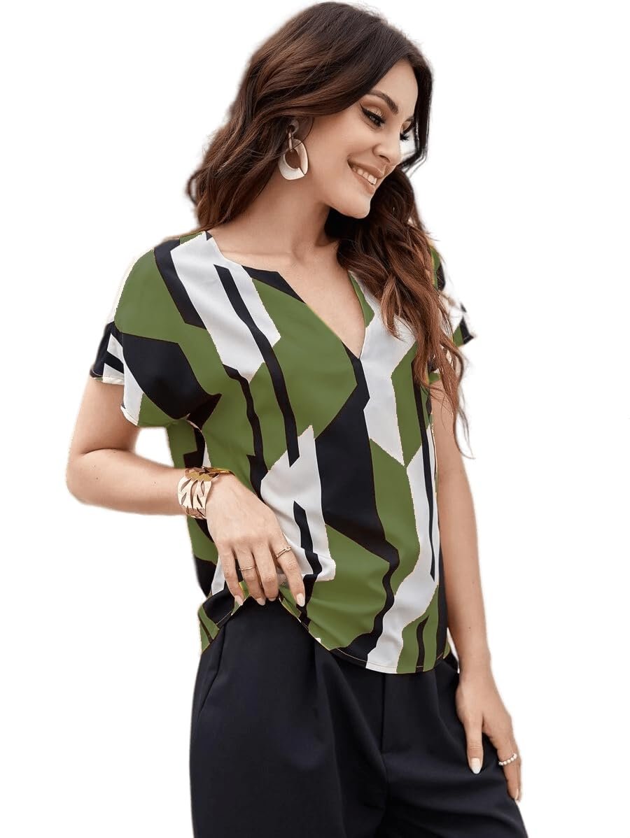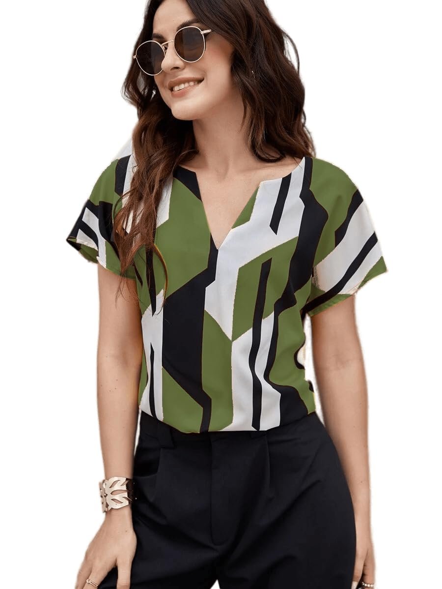 Classy Fashion Women’s Geometric Pattern Polyester Blend Tunic Top with V-Neck Half Sleeve and Standard Length Pull Closure Type|Women’s Tops