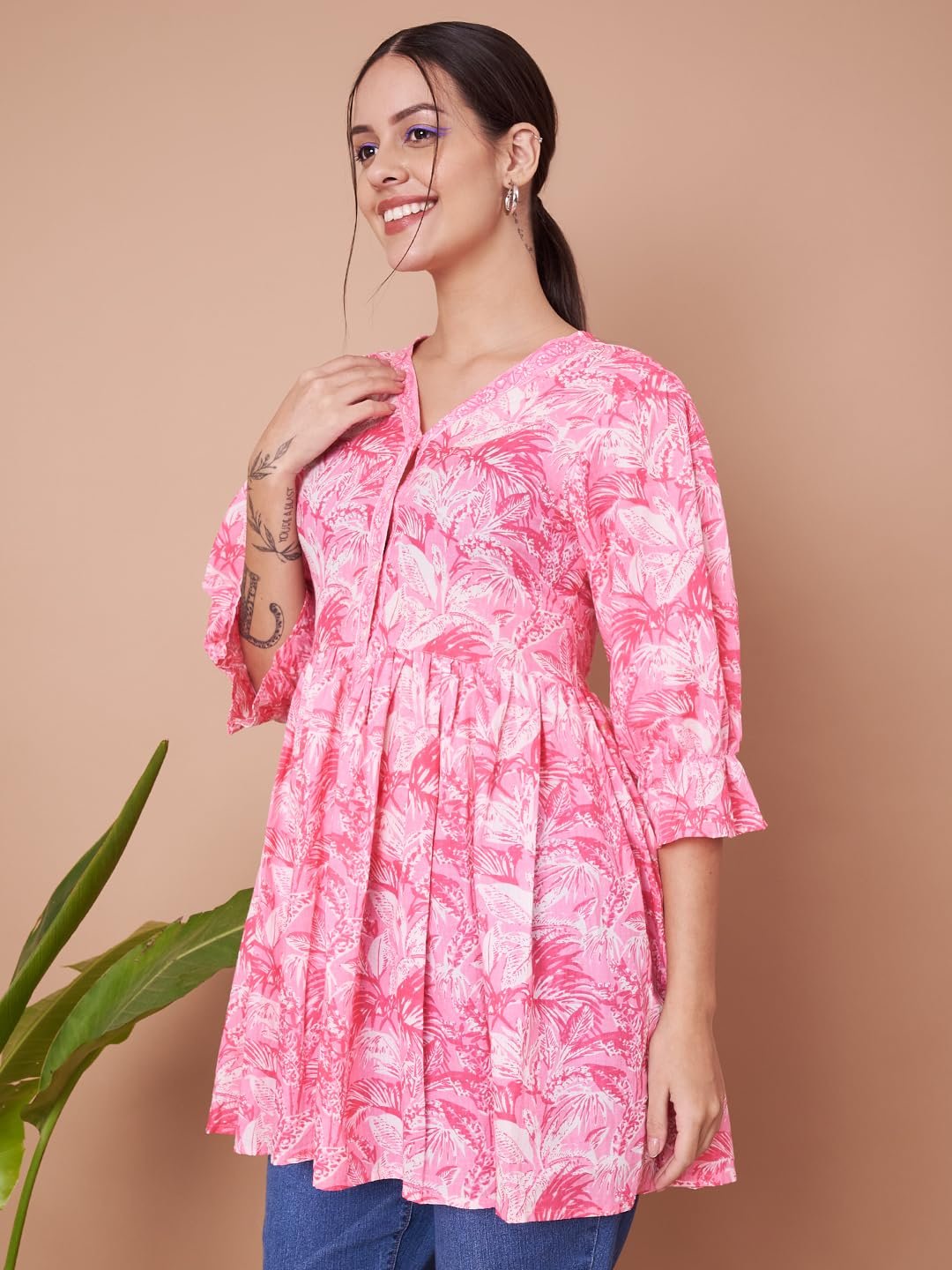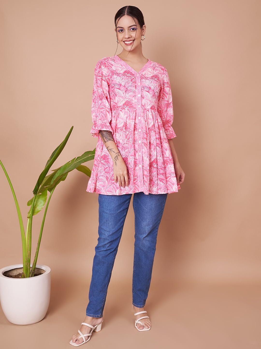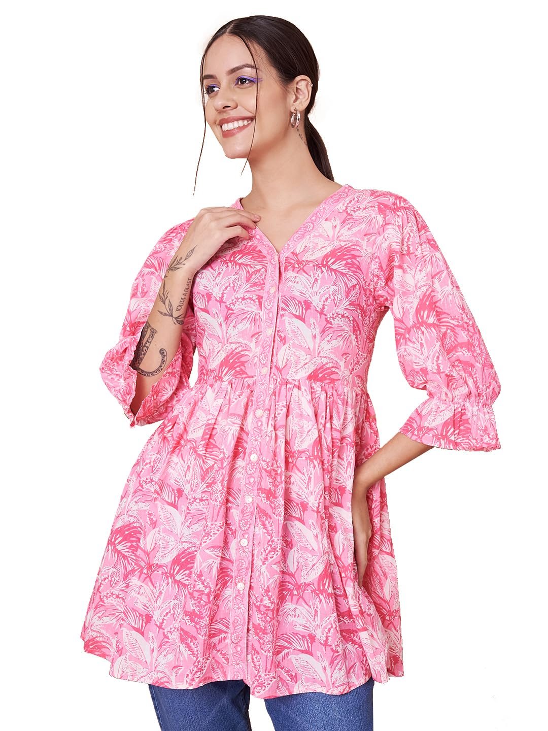 FABRIC FITOOR Womens Jaipuri Pure Cotton Pink Color Tiered Fit & Flared Casual Top (Size-S)