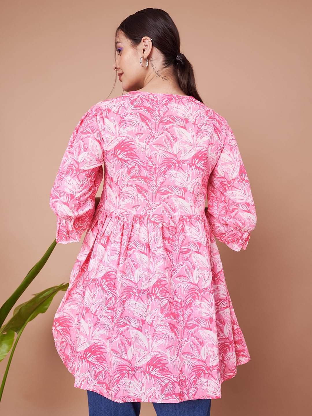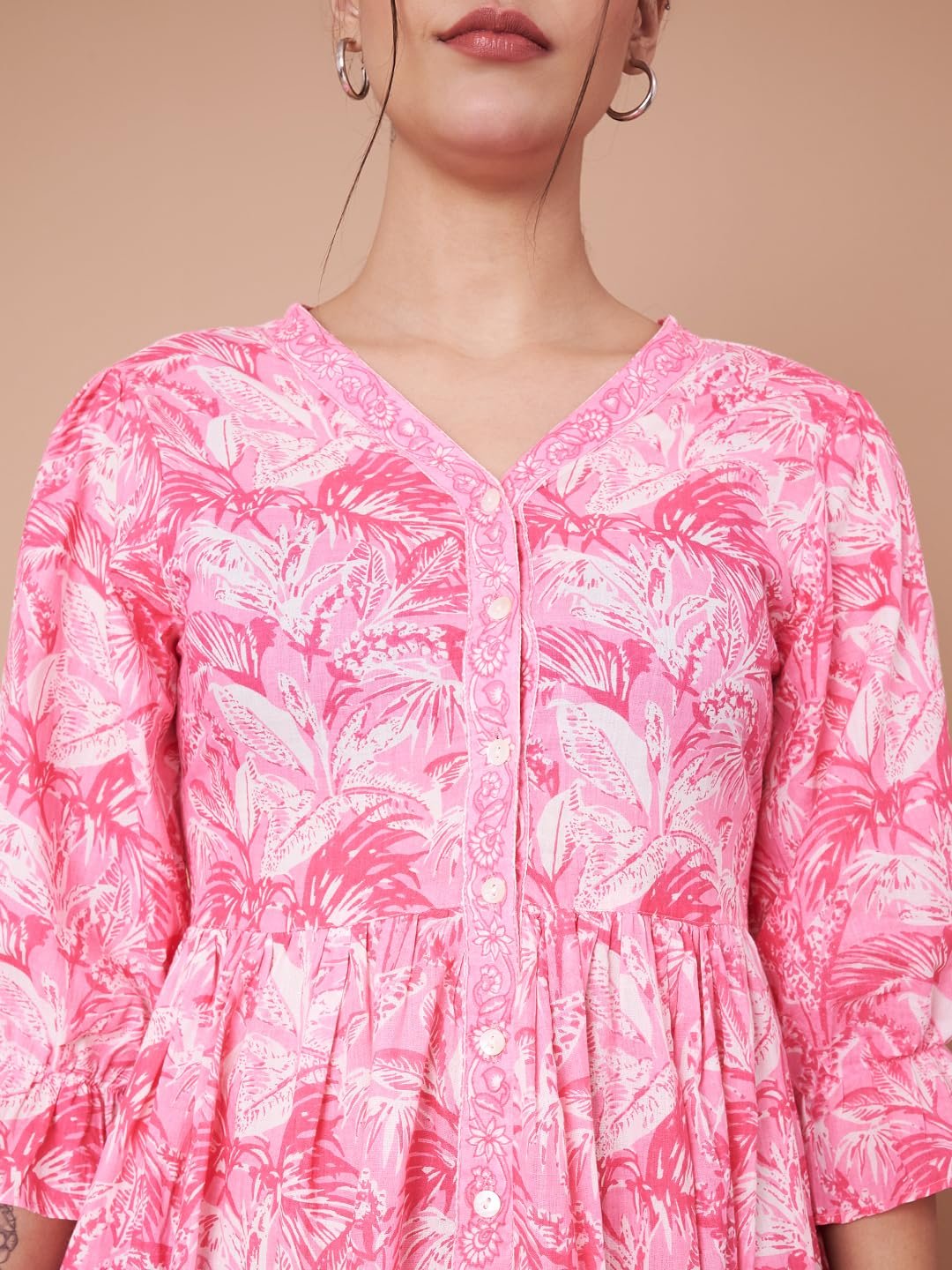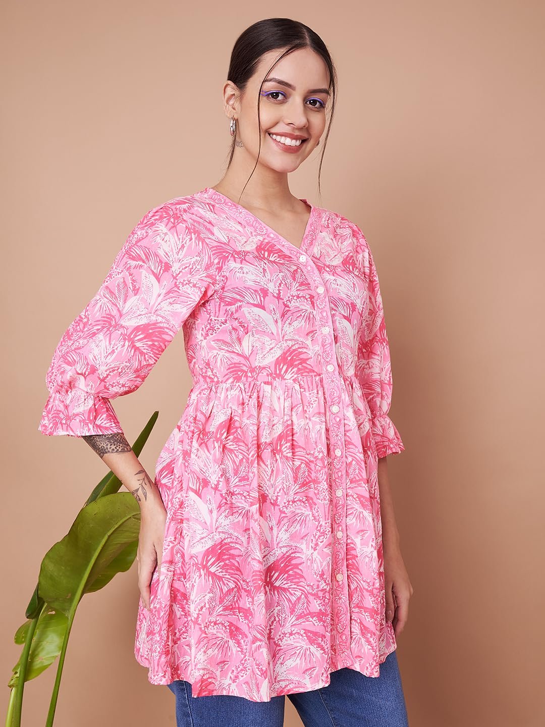 FABRIC FITOOR Womens Jaipuri Pure Cotton Pink Color Tiered Fit & Flared Casual Top (Size-S)