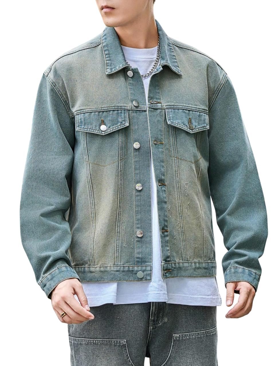 GRECIILOOKS Unisex Denim Jacket For Men & Women Stylish | Cotton Blend Casual Jean Jacket | Lightweight Button Down Streetwear Outerwear Travel Winterwear (Gl-Djt-Ms6330-Xl-Greenish Blue)