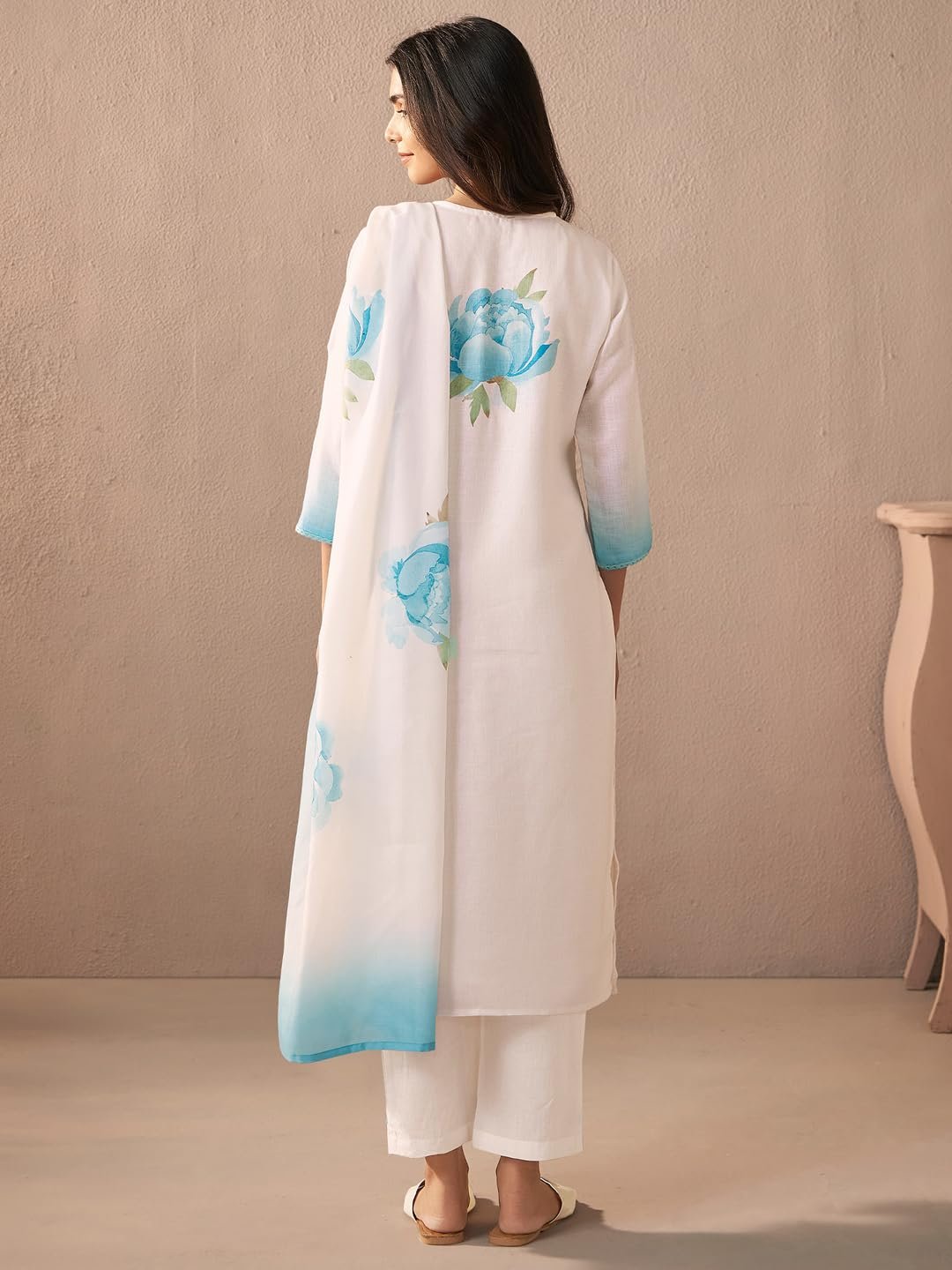 INDO ERA Women’s Straight Linen Floral Print with Sequines Work Kurta Pant with Dupatta Set (Off White_IEOUT9826_Medium)