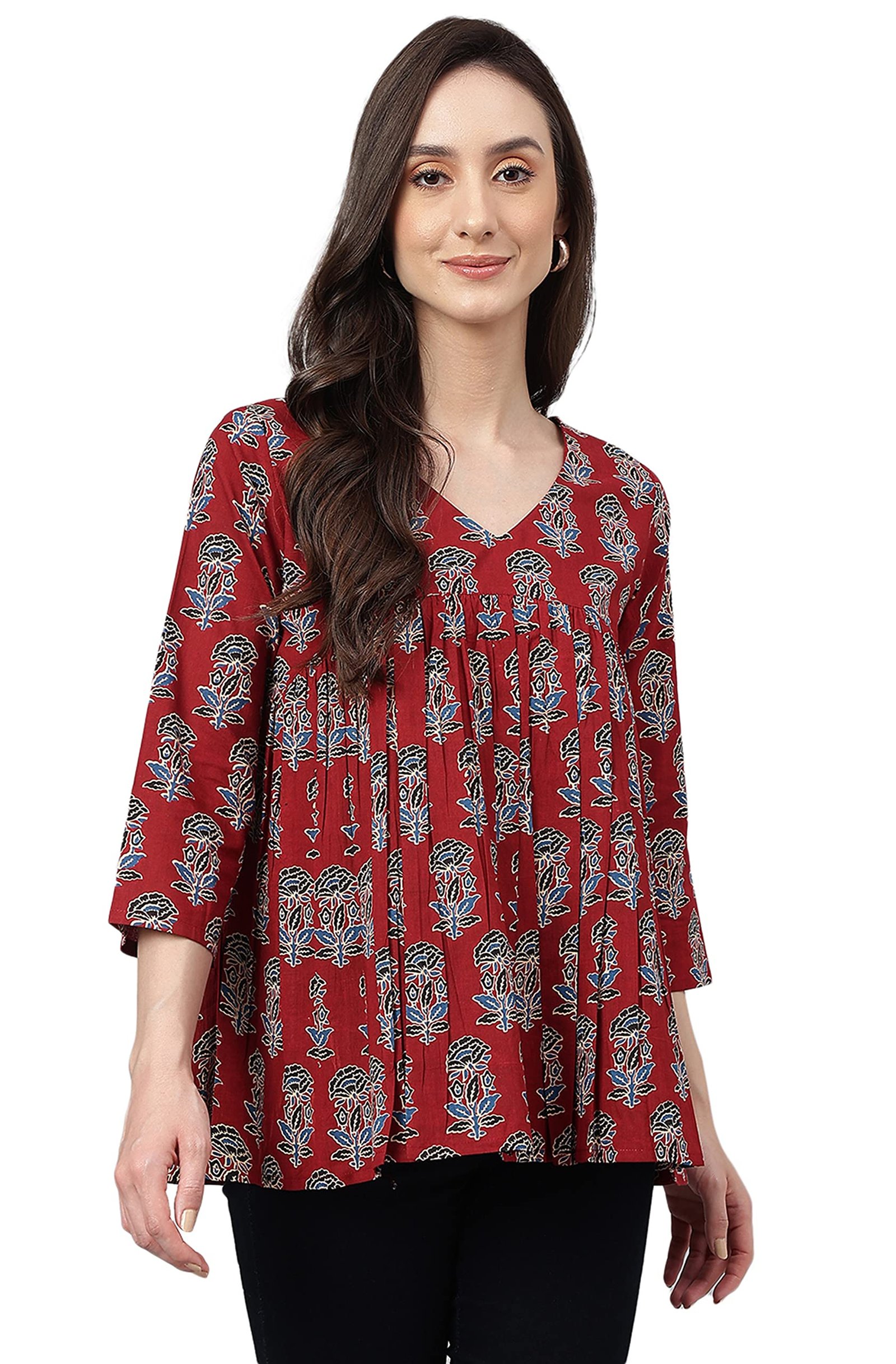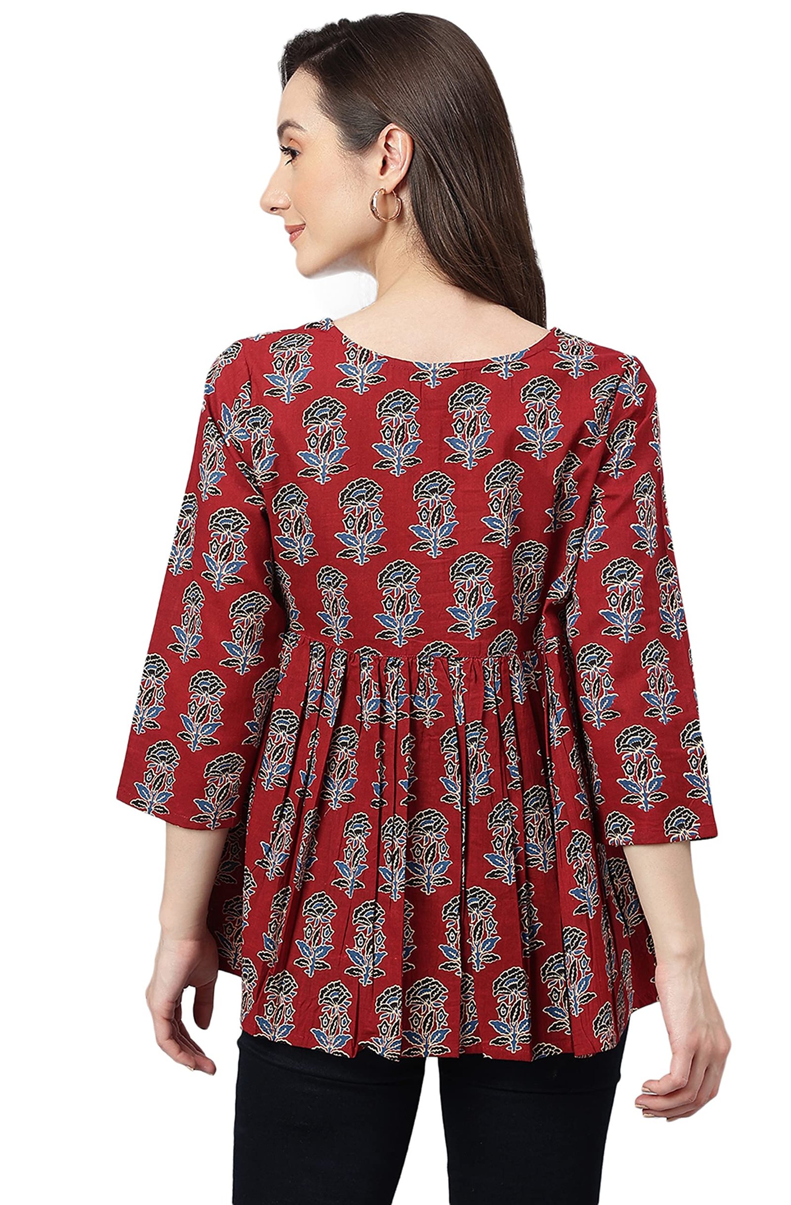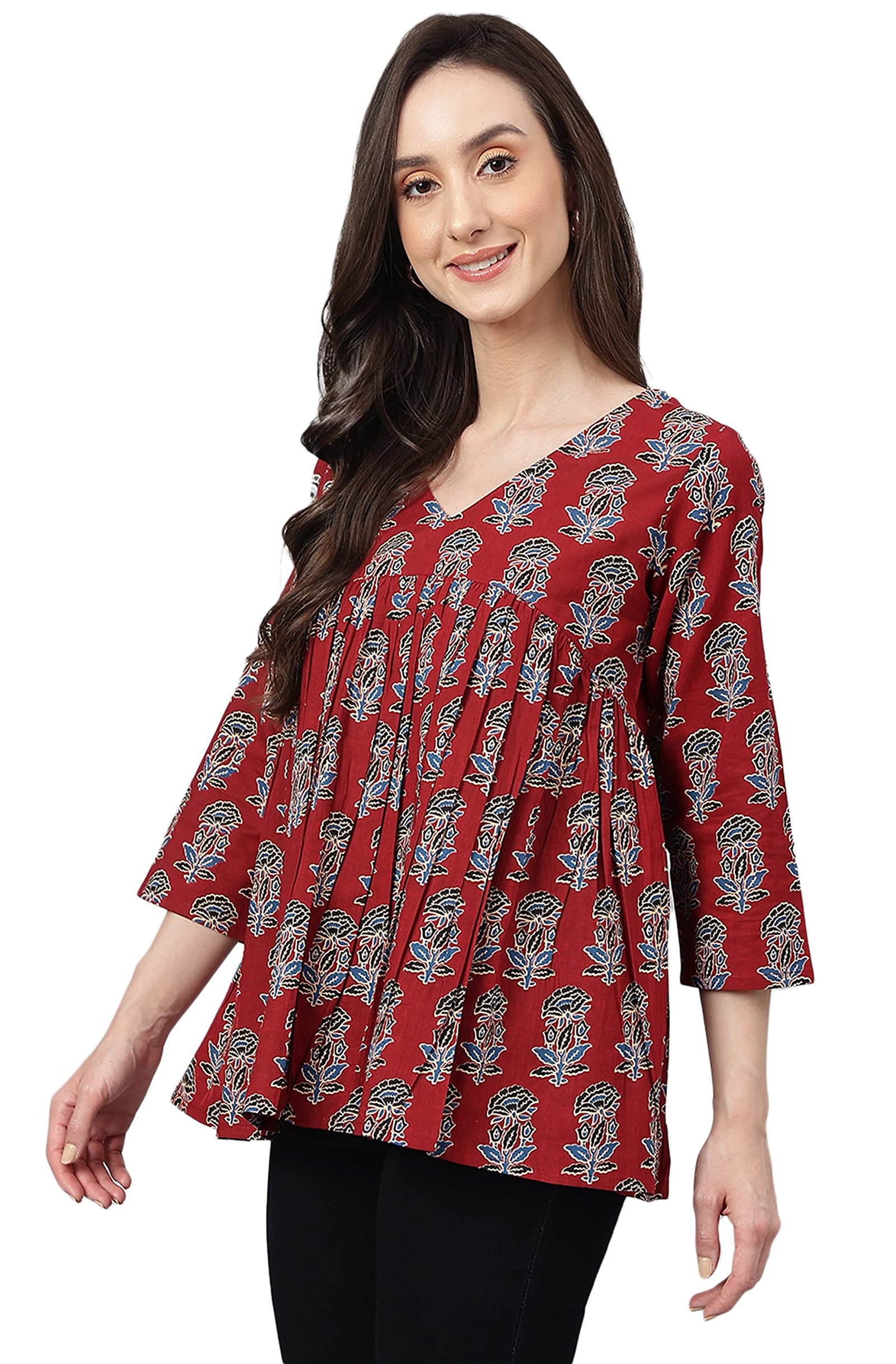 <p><b>Brand:</b> Janasya</p><p><b>Color:</b> Maroon</p><p><b>Features:</b> <ul><li>Fabric: Pure Cotton</li><li>Style:- Length: 26(inch) | Pattern: Floral Block Print | Occasion: Casual | Type: Flared| Sleeve Type: 3/4 Sleeve (Regular Sleeves) | Color: Maroon</li><li>Packet contain: 1 Readymade Top</li><li>Declaration: Please choose a garment size that is two inches more than your body measurement. e.g:- for bust size -36 inch, select garment size - Medium (M). There might be slight variation in the actual color of the product due to different screen resolutions.</li><li>Remark: Accessories are just for presentation, it is not included with this product.</li></ul></p><p><b>Package Dimensions:</b> 24x310x150</p><p><b>Details:</b> DescriptionMaroon cotton floral printed flared top by Janasya crafted in cotton fabric featuring V-neck, 3/4 sleeves with fit and flare silhouette.</p>