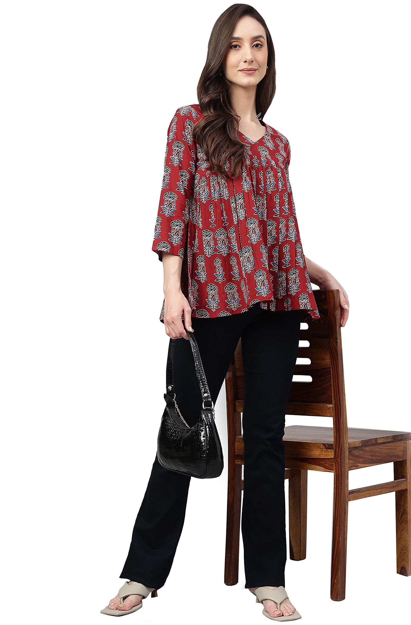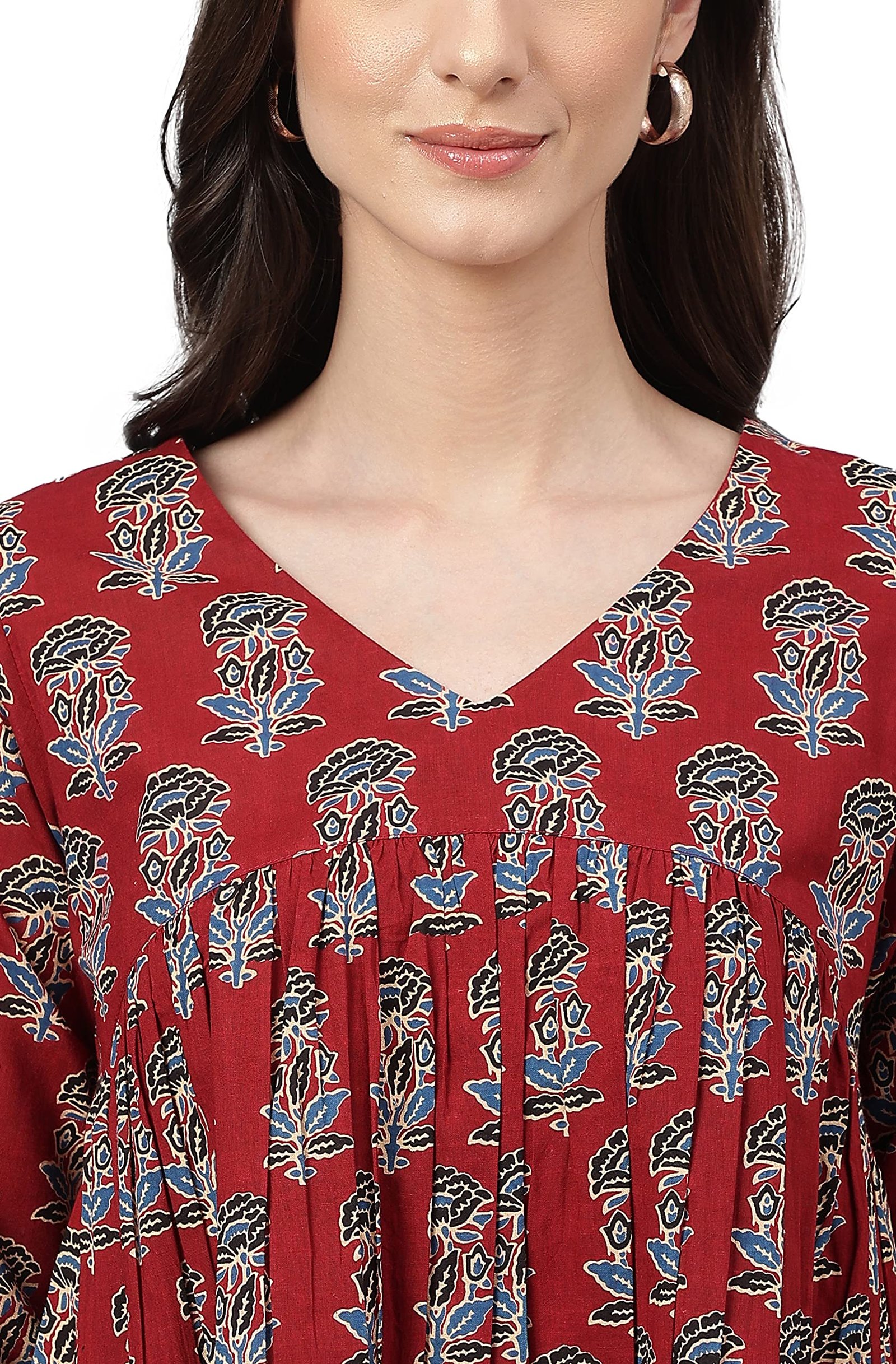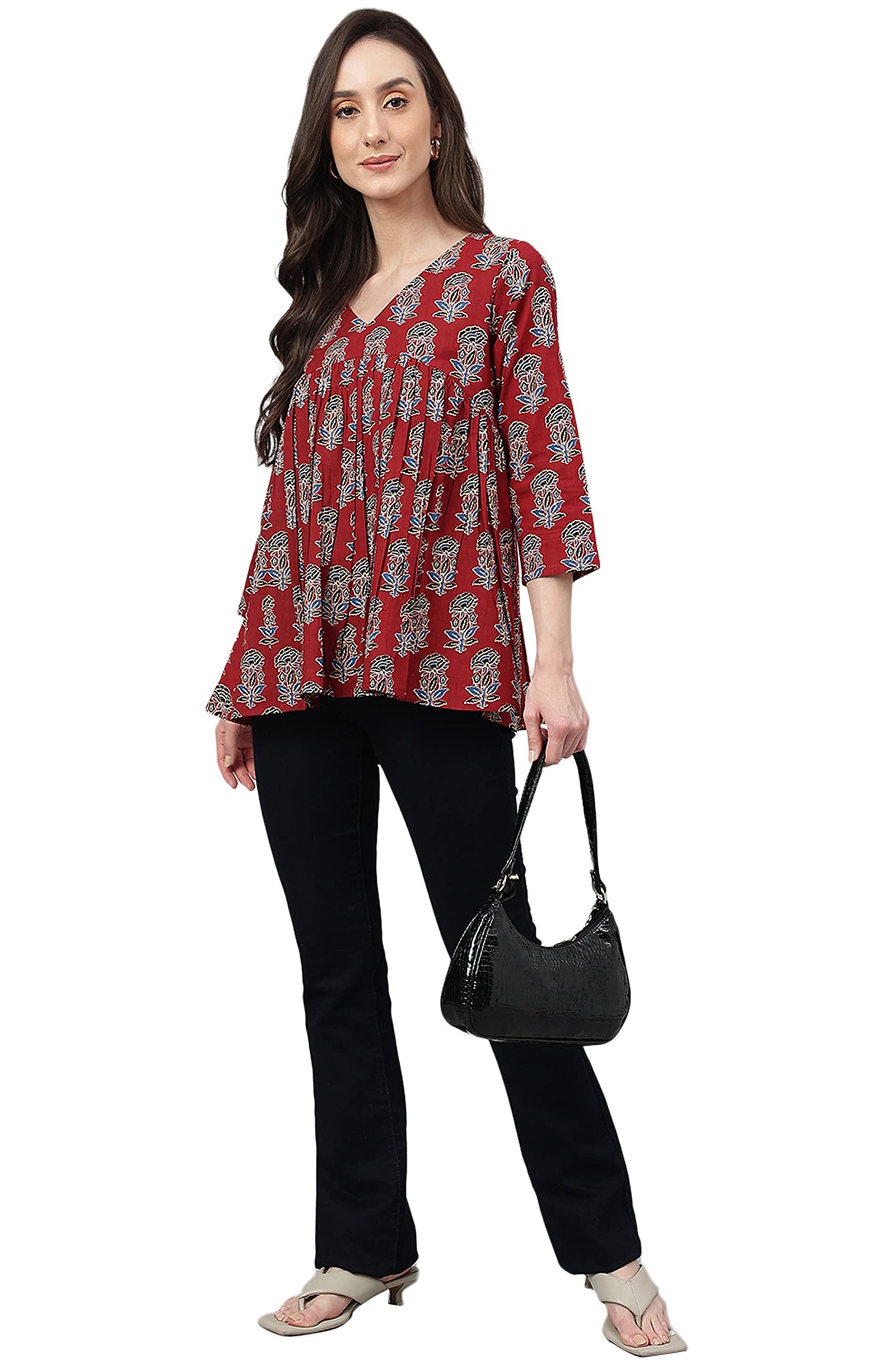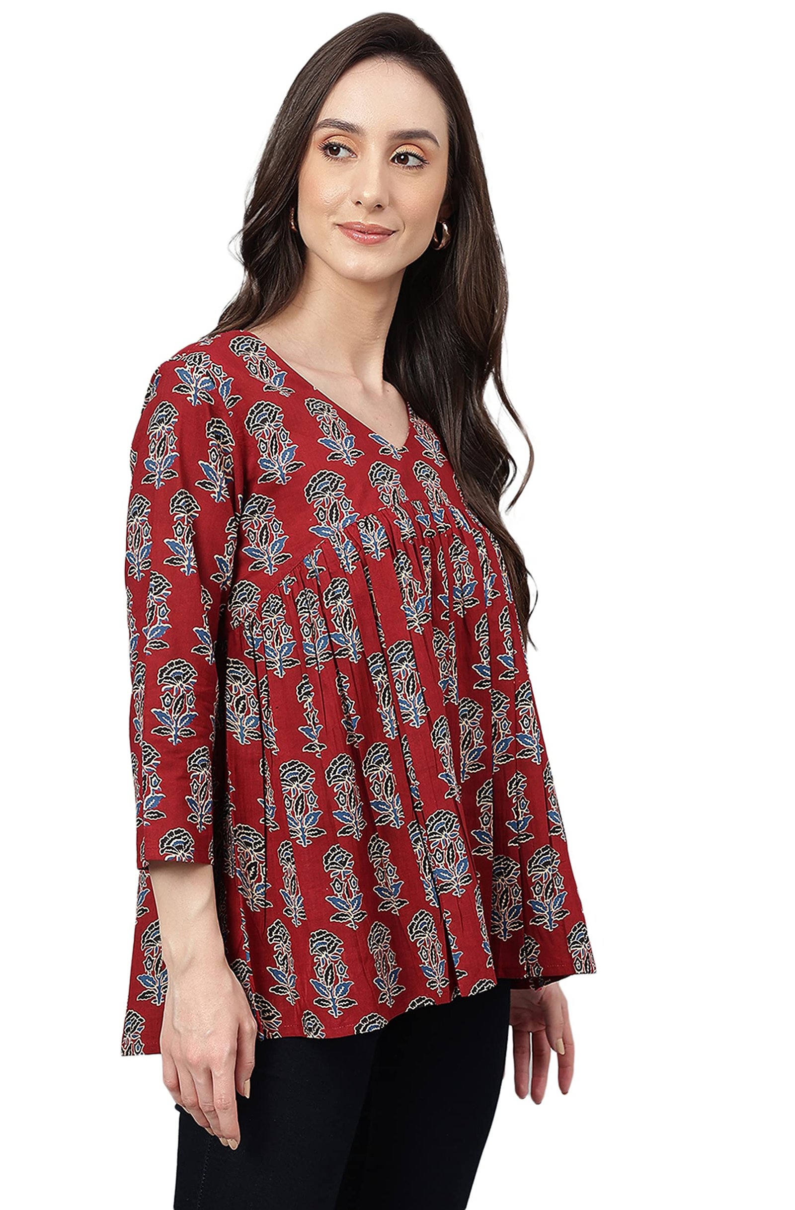 <p><b>Brand:</b> Janasya</p><p><b>Color:</b> Maroon</p><p><b>Features:</b> <ul><li>Fabric: Pure Cotton</li><li>Style:- Length: 26(inch) | Pattern: Floral Block Print | Occasion: Casual | Type: Flared| Sleeve Type: 3/4 Sleeve (Regular Sleeves) | Color: Maroon</li><li>Packet contain: 1 Readymade Top</li><li>Declaration: Please choose a garment size that is two inches more than your body measurement. e.g:- for bust size -36 inch, select garment size - Medium (M). There might be slight variation in the actual color of the product due to different screen resolutions.</li><li>Remark: Accessories are just for presentation, it is not included with this product.</li></ul></p><p><b>Package Dimensions:</b> 24x310x150</p><p><b>Details:</b> DescriptionMaroon cotton floral printed flared top by Janasya crafted in cotton fabric featuring V-neck, 3/4 sleeves with fit and flare silhouette.</p>