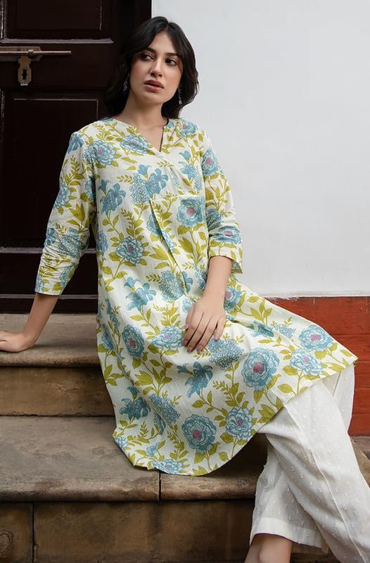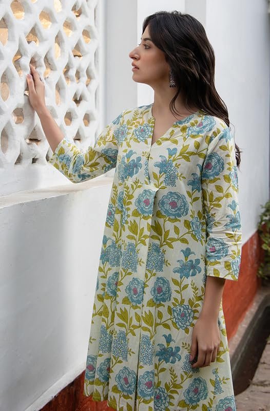 <p><b>Brand:</b> Janasya</p><p><b>Color:</b> Off White & Blue</p><p><b>Features:</b> <ul><li>Tunic For Women, Tunic Fabric: Cotton</li><li>Tunic Length: 34(IN) | Colour: Off White | Pattern: Floral | Occasion: Casual | Style: Regular | Sleeve Type: Three-Quarter Sleeves (Regular Sleeves )</li><li>Package Contains: 1 Tunic</li><li>Declaration: Please choose a garment size that is two inches more than your body measurement. e.g:- for bust size -36 inch, select garment size - Medium (M). There might be slight variation in the actual color of the product due to different screen resolutions.</li><li>Remark: Accessories are just for presentation, it is not included with this product.</li></ul></p><p><b>Package Dimensions:</b> 25x307x150</p><p><b>Details:</b> DescriptionDesigned for everyday elegance, this cream floral flared tunic offers both comfort and style, making it a versatile staple for any occasion. Embraced with notch neckline and cuffed sleeved the tunic is elevated with front pleats in rich off-white color. Elevate your look with its graceful silhouette with side seam pocket and embrace the beauty of floral prints in every step.</p>