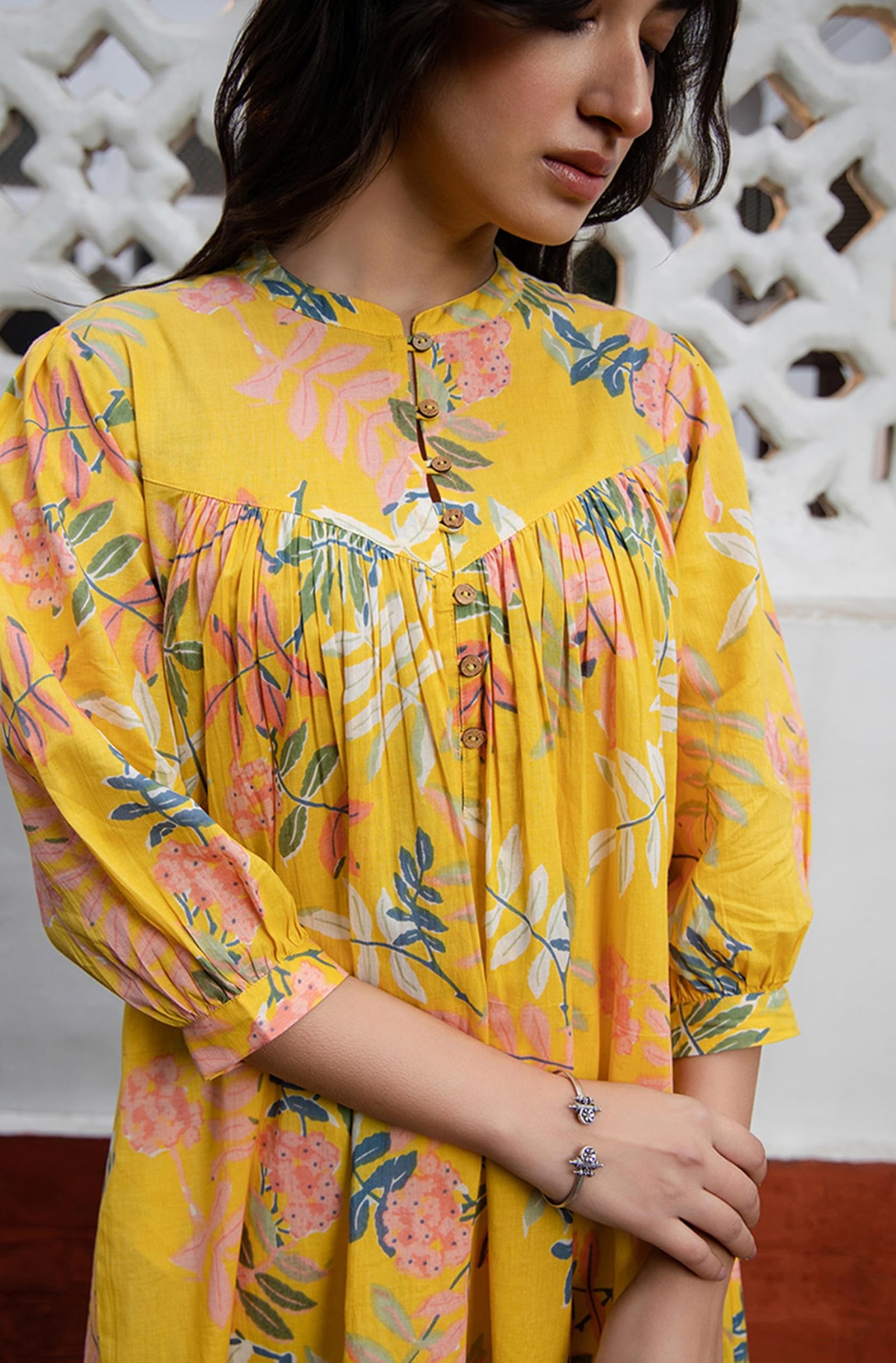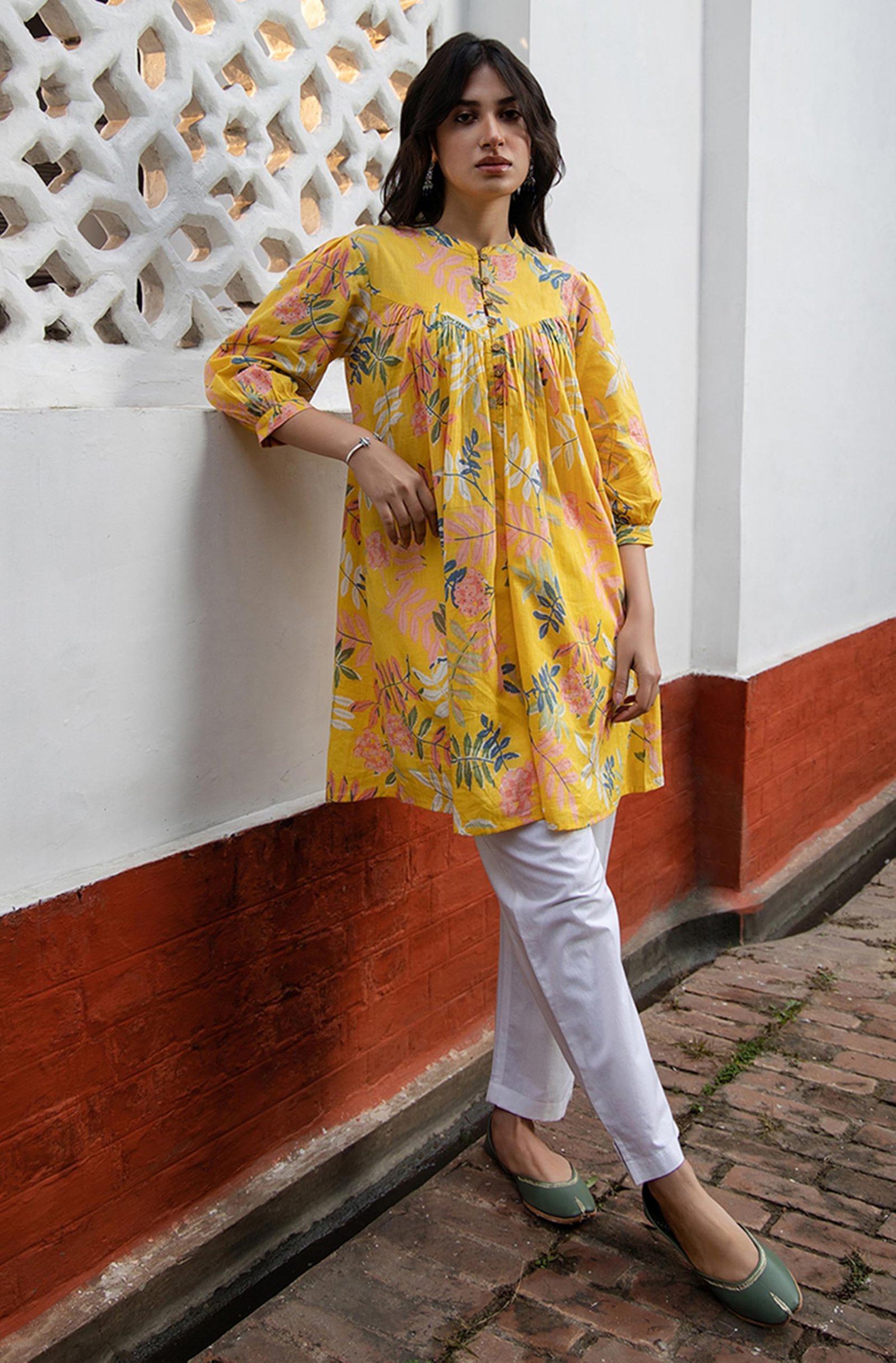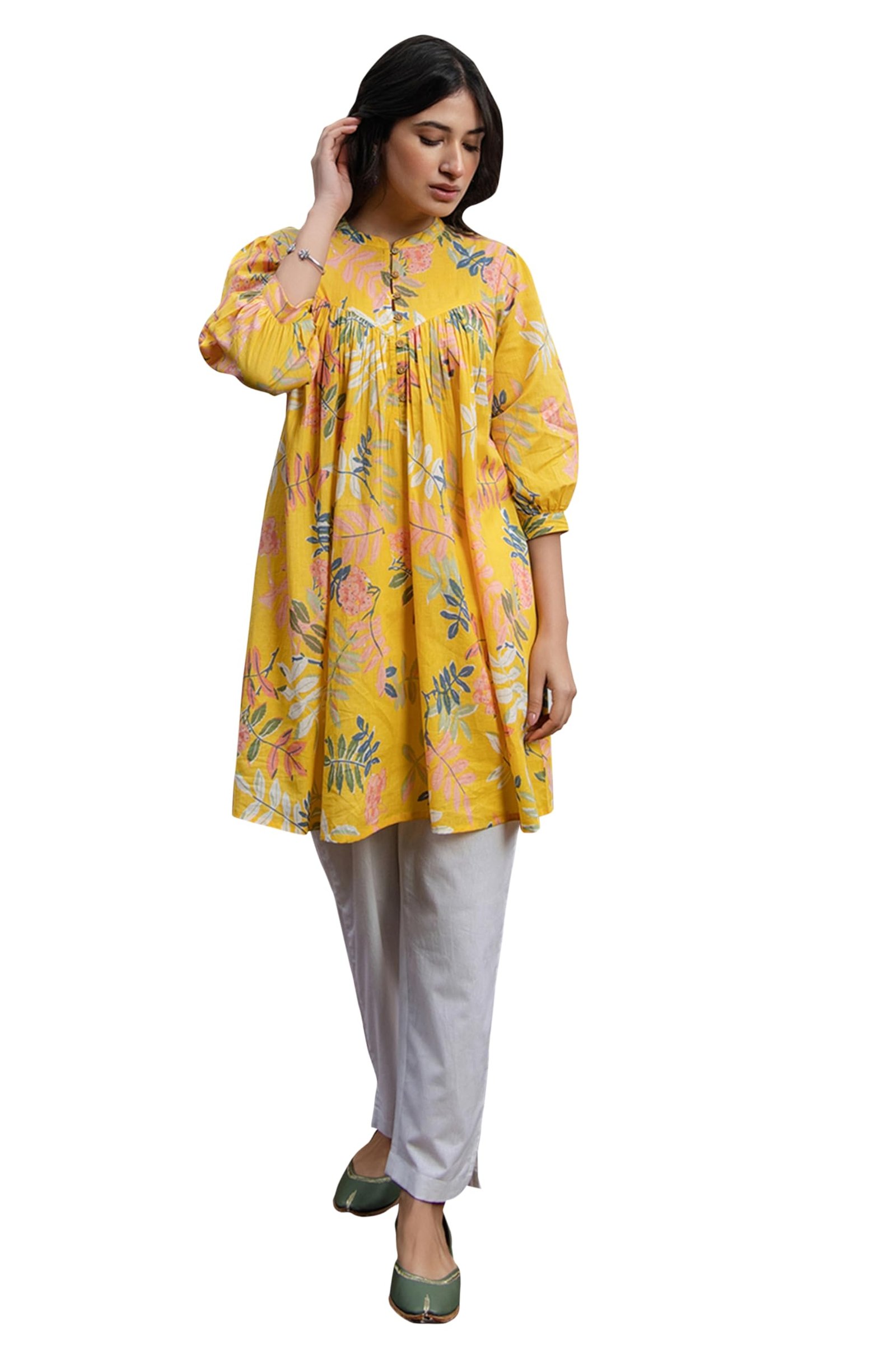 <p><b>Brand:</b> Janasya</p><p><b>Color:</b> Yellow</p><p><b>Features:</b> <ul><li>Tunic For Women | Tunic Fabric: Cotton</li><li>Tunic Length: 34(IN) | Colour: Yellow | Pattern: Trophical | Occasion: Casual | Style: Gathered | Sleeve Type: Three-Quarter Sleeves (Puff Sleeves)</li><li>Package Contains: 1 Tunic</li><li>Declaration: Please choose a garment size that is two inches more than your body measurement. e.g:- for bust size -36 inch, select garment size - Medium (M). There might be slight variation in the actual color of the product due to different screen resolutions.</li><li>Remark: Accessories are just for presentation, it is not included with this product.</li></ul></p><p><b>Package Dimensions:</b> 22x326x180</p><p><b>Details:</b> DescriptionStyle effortlessly in the yellow cotton gathered tunic by Janasya, a must-have in your casual wardrobe, the cotton tunic crafted in trophical print features band collar neck with puff sleeves and yoke gathers makes it a flared perfect casual attire. Embrace your casual dayouts pairing the tunic with your favorite bottom and elevate the style with minimal accessories.</p>