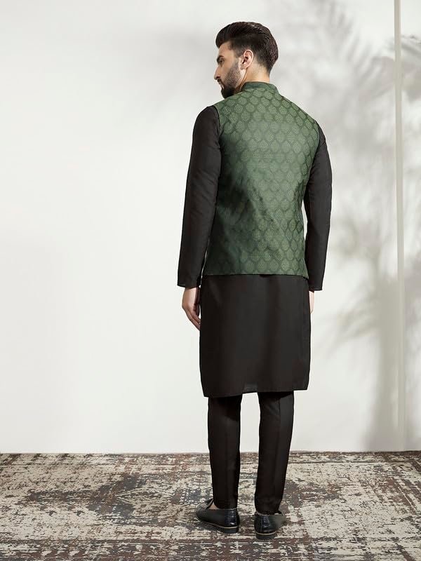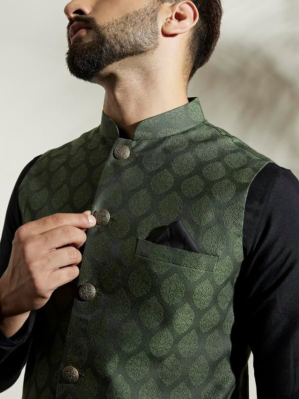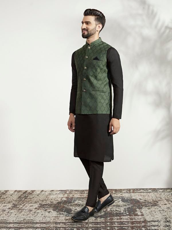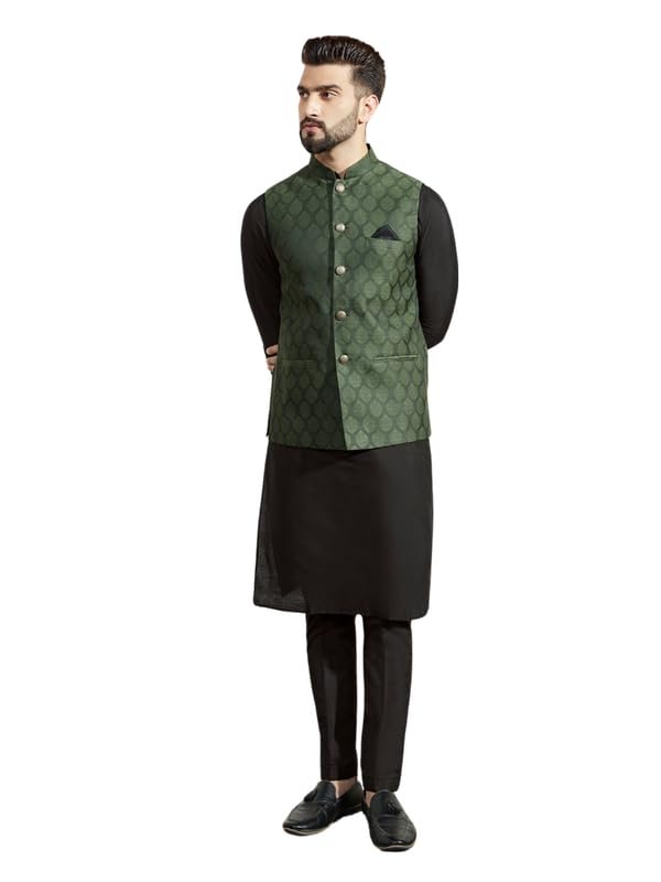 <p><b>Brand:</b> KISAH</p><p><b>Color:</b> Olive</p><p><b>Features:</b> <ul><li>Material: Jacquard; Sleeves: Full Sleeves; Pattern: Woven Design</li><li>TIMELESS & VERSITILE: Kurta jacket sets for men are designed to be timeless pieces that can be worn on various occasions. They are versatile outfits that can be dressed up or down, making them suitable for both formal and casual settings.</li><li>COMFORTABLE & STYLISH: Kurta Jacket Sets prioritize comfort without compromising on style. They are typically made from high-quality fabrics that feel great against the skin, allowing men to look and feel their best while wearing them.</li><li>OCCASION AND GIFTING: The Kurta Jacket Set with good-quality fabric can be worn both casually and formally. It is suitable for occasions such as weddings, ceremonies, parties, regular wear, festivals, Lohri, Makar Sankranti, Baisakhi, Holi, Father's Day, Eid, Raksha Bandhan, Dussehra, Diwali, Navratri, Pooja, Christmas, Onam, Ganesha, business meetings, and daily use. Additionally, it can be given as a gift to family and friends.</li><li>HAND MADE IN INDIA: Individually made by skilled artisans, each kurta jacket set is meticulously crafted and checked for finesse, ensuring exceptional quality.</li></ul></p><p><b>Package Dimensions:</b> 61x361x730</p><p><b>Details:</b> DescriptionDiscover a stylish Kurta set for men with a Nehru jacket, Fashionable traditional attire perfect for adding a touch of sophistication to your ethnic wardrobe.</p>
