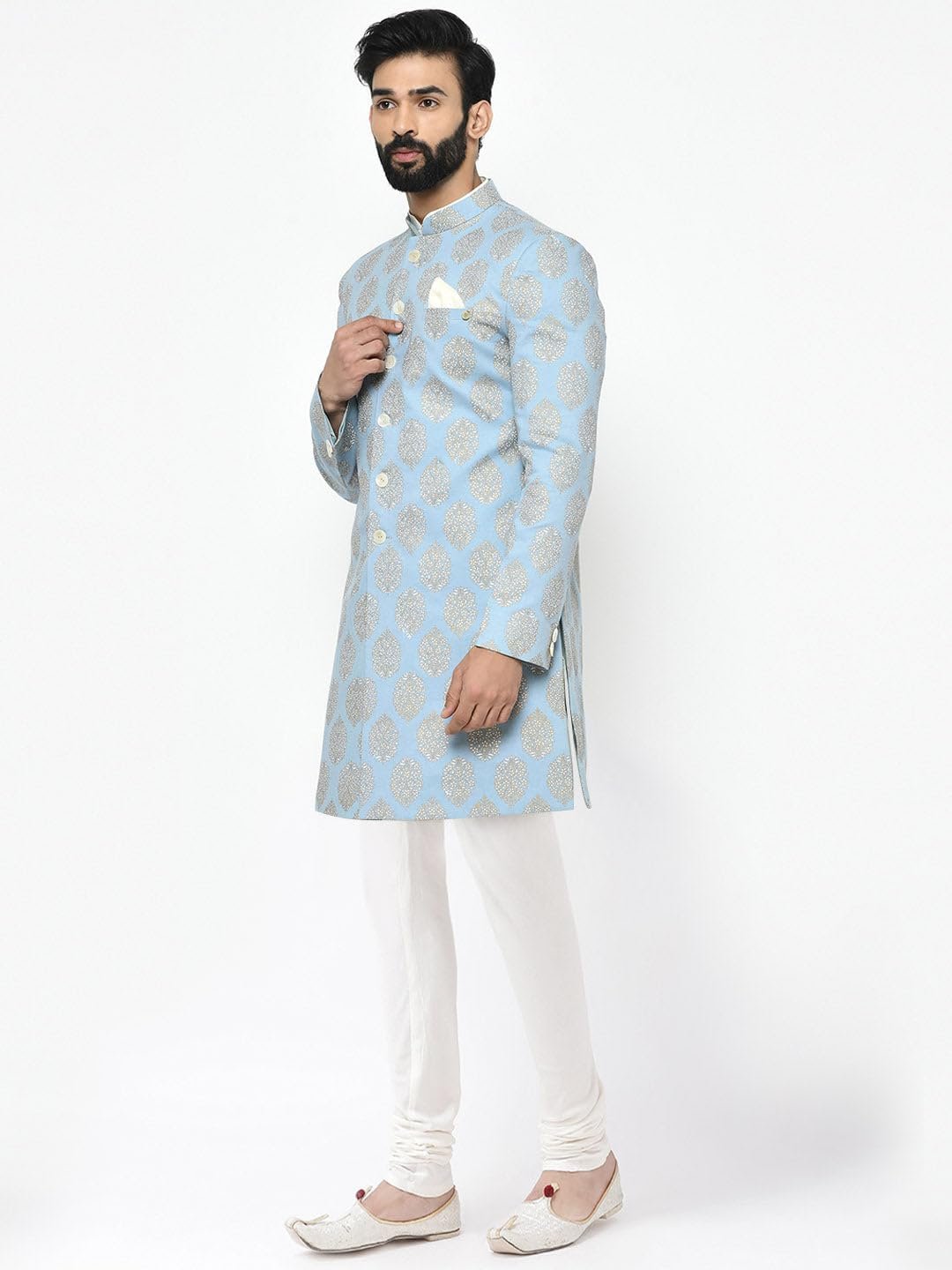 <p><b>Brand:</b> KISAH</p><p><b>Color:</b> Blue</p><p><b>Features:</b> <ul><li>PREMIUM FABRIC – Crafted in pure cotton with a printed design, this sherwani offers breathable comfort and a regal look for weddings and festivals.</li><li>COMPLETE SET – Includes a mandarin-collar sherwani and matching churidar with refined tailoring, ideal for grooms and festive occasions.</li><li>DESIGNER LOOK – Inspired by traditional Indian craftsmanship with a modern Indo-Western silhouette — great for haldi, sangeet, and reception events.</li><li>MADE IN INDIA – Handcrafted by skilled artisans with precision embroidery and durable construction; fits true to size for a regular, flattering fit.</li><li>WASH CARE & OCCASIONS – Dry clean recommended to maintain fabric richness. Perfect for weddings, Diwali, Eid, or gifting (Accessories not included).</li></ul></p><p><b>Package Dimensions:</b> 63x360x710</p><p><b>Details:</b> DescriptionMens Sherwani Set</p>