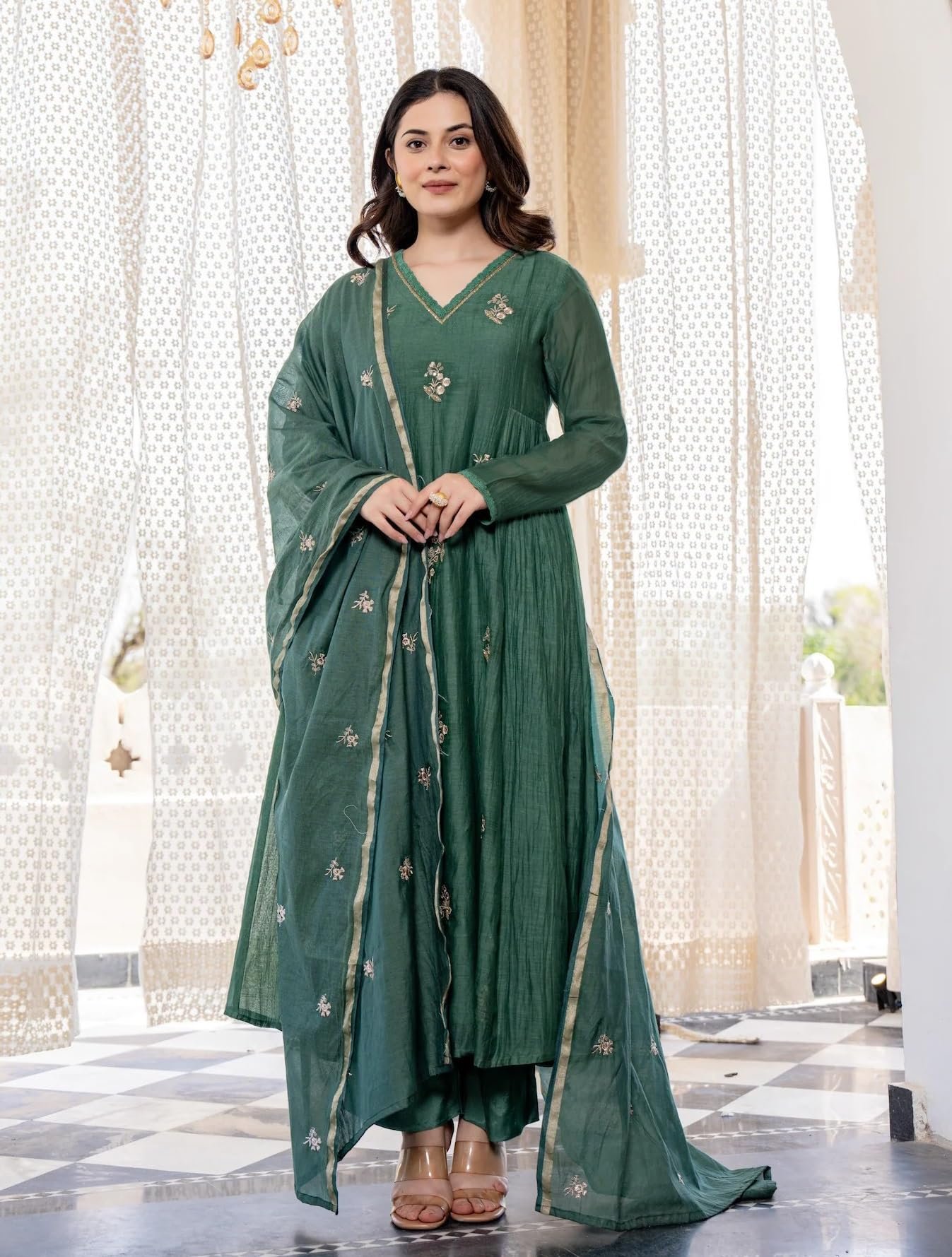 KLOSIA Women Embroidery Solid Anarkali Kurta and Pant Set with Dupatta Green