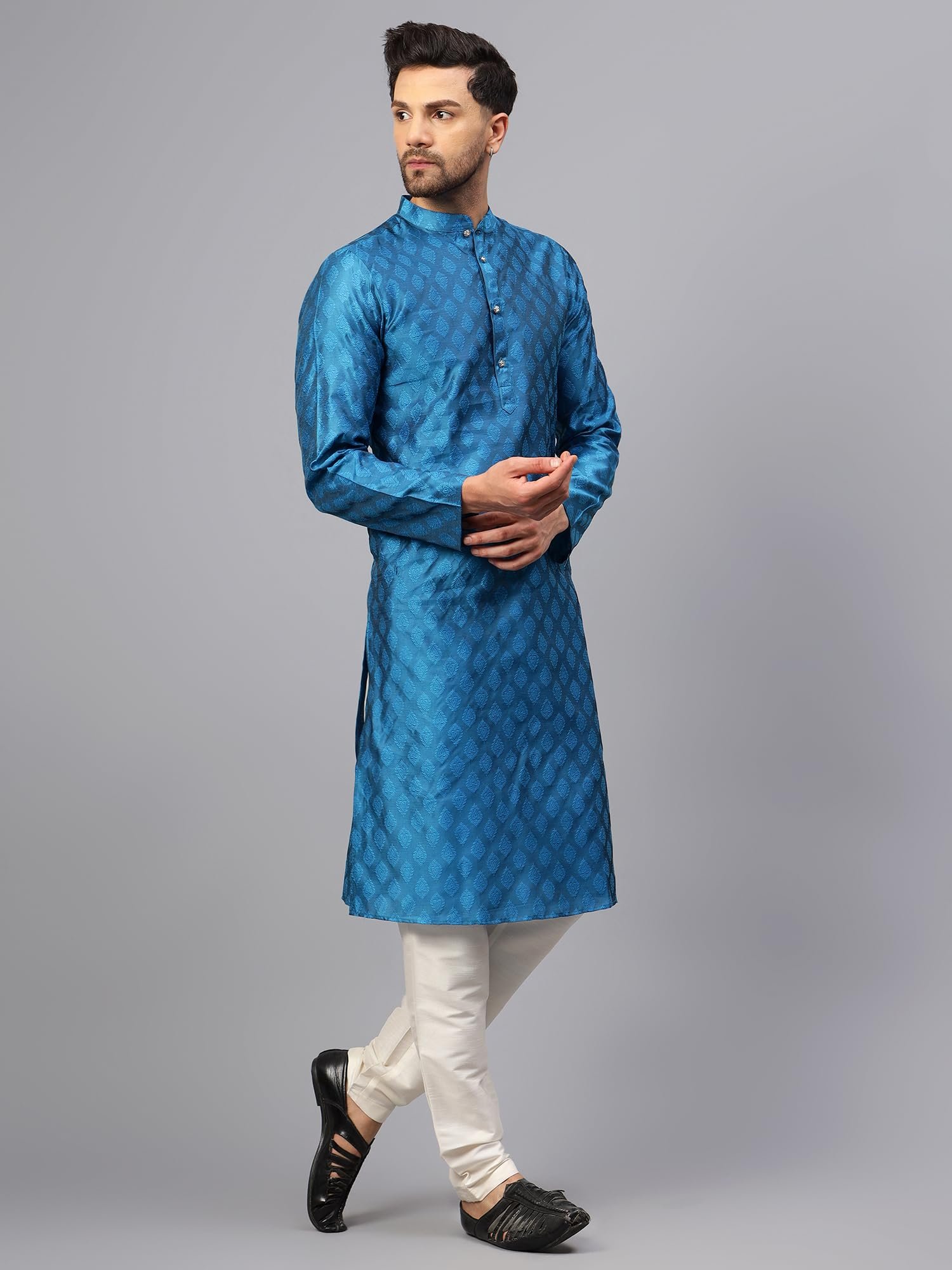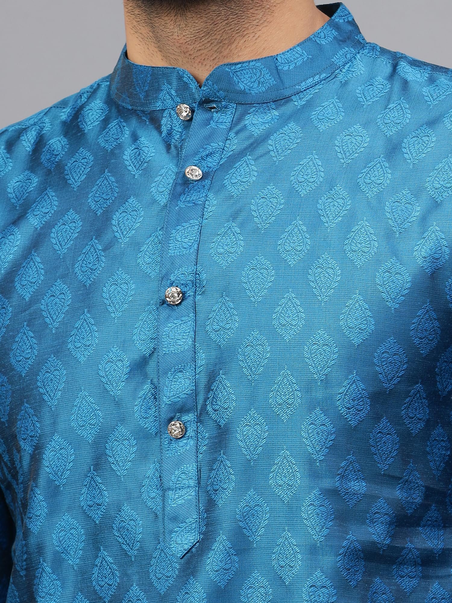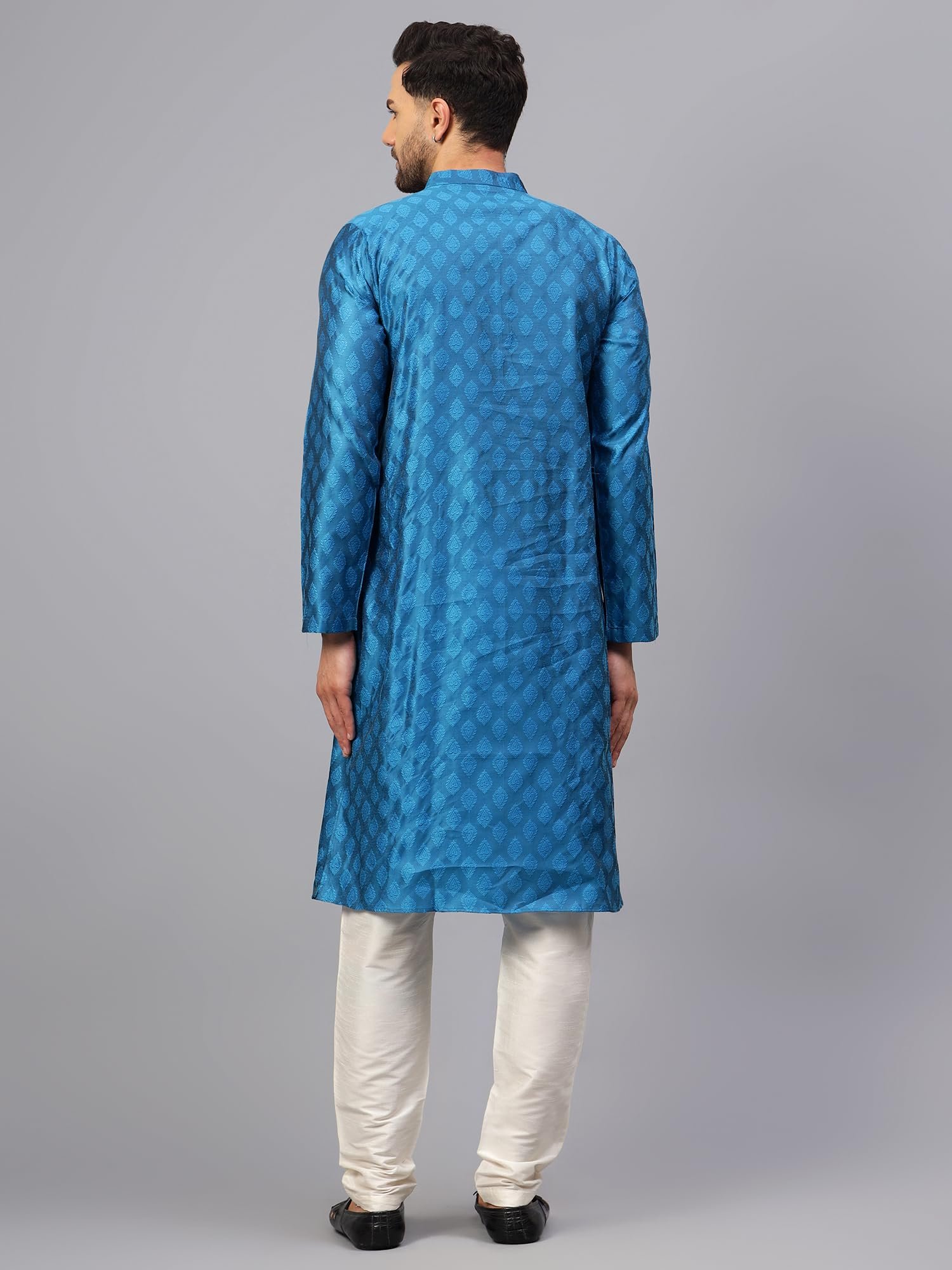 <p><b>Brand:</b> LATEST CHIKAN</p><p><b>Color:</b> Blue</p><p><b>Features:</b> <ul><li>Fabric: Cotton Silk Blend | Contents: a Ethnic Kurta Pyjama Set</li><li>Medium length and Regular Fit. Our Kurta fitting is usually slightly relaxed compared to a Regular Shirt's fitting. Select your Kurta size based on your chest dimension. Note: if one has a heavier abdomen compared to chest then he should select one size bigger kurta. Our Churidar Pajamas have drawstrings and a separate pocket attached to it. The pyjama bottom mohri is usually kept narror to bring out the best possible churi look.</li><li>All our kurtas have four inches loosening over the body measurement. So if your chest round measurement is 38 inches then you should go for a 38 (Medium) size Kurta which will have a garment ready chest measurement of 42 inches. We offer six sizes - Small = 36 (Chest - 40), Medium = 38 (Chest - 42), Large = 40 (Chest - 44), X- Large = 42 (Chest - 46), XX - Large = 44 (Chest - 48) and XXX - Large = 46 (Chest - 50).</li><li>Although popularly known as Kurta Pyjama but can be suitably used as pathani suit for men stylish, jubba for men, panjabi for men or khan dress for men stylish. Most material used for kurta under 300 tensil count only.</li><li>Wash Care Instructions: Dry Clean preferably or cold light wash | Disclaimer: We have made a consistent effort to make the colors and finishes similar to the image of the products you see on screen. However, the actual product and the images on the website can differ! Customer's discretion is advised.</li></ul></p><p><b>Package Dimensions:</b> 53x287x340</p>