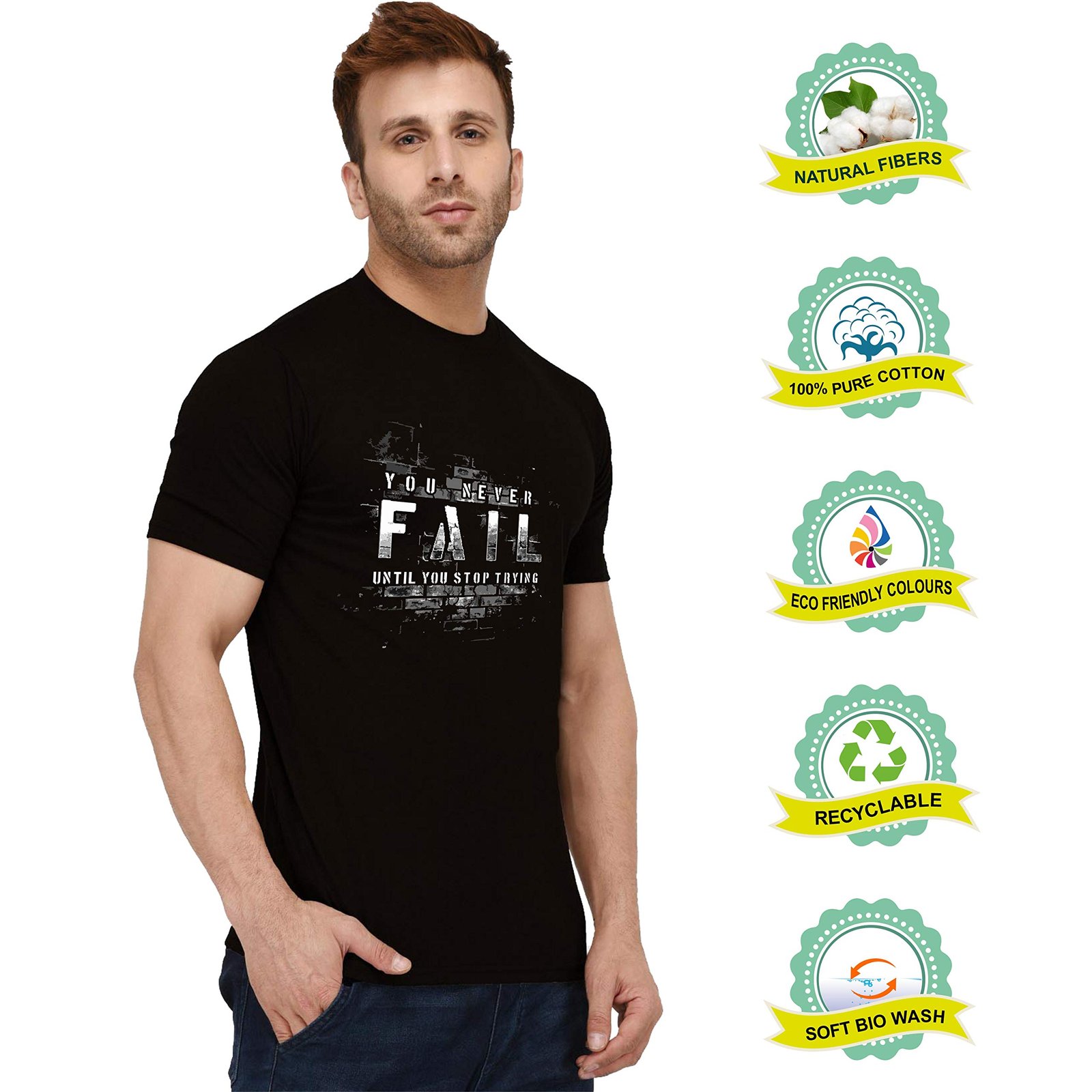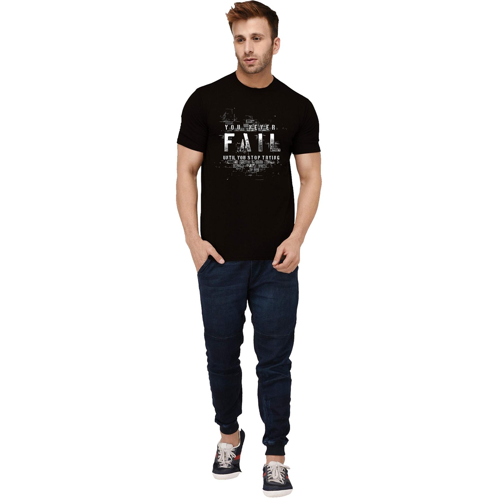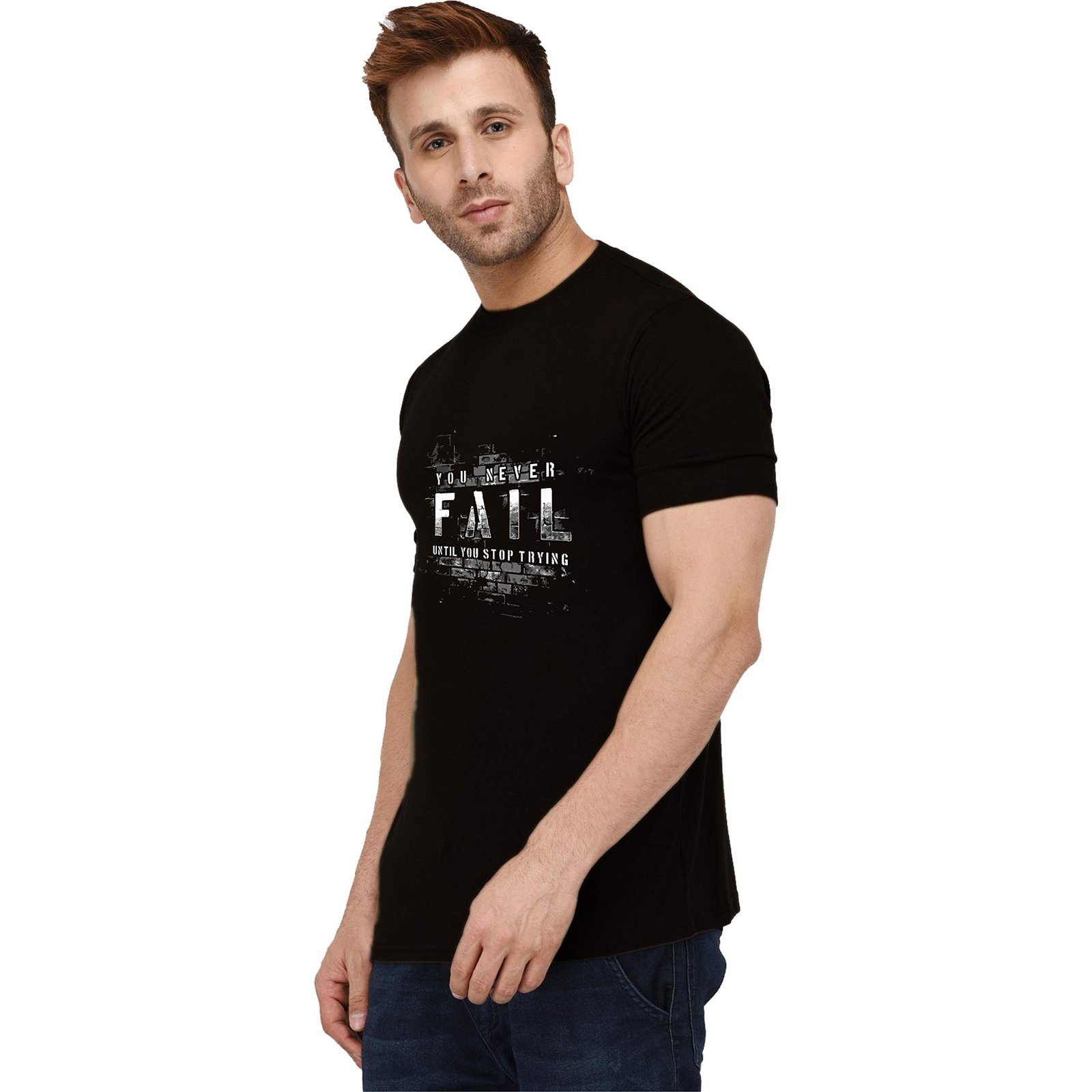 London Hills Men’s Cotton Regular Fit Half Sleeve Never Fail Slogan Printed Black T-Shirt