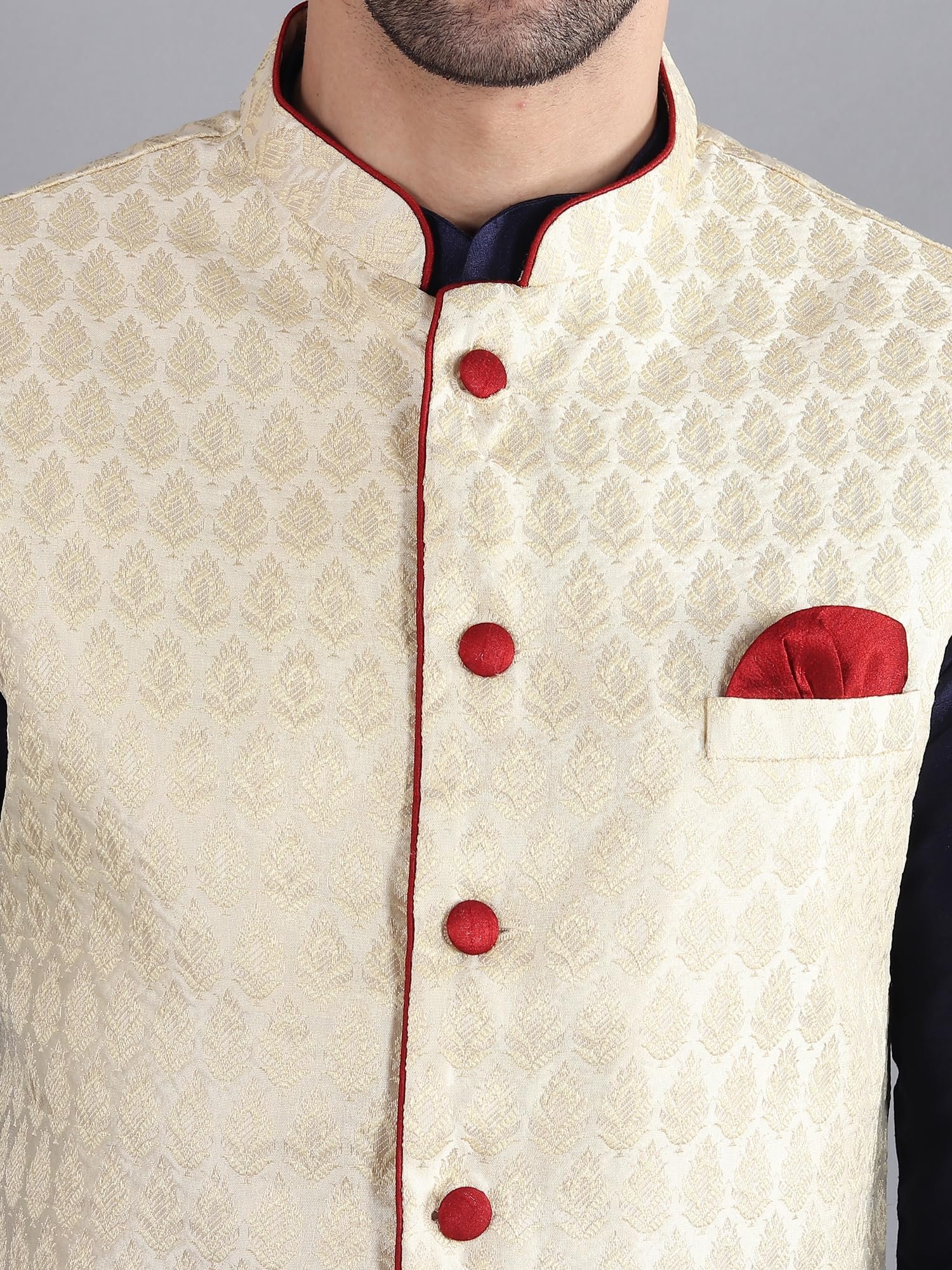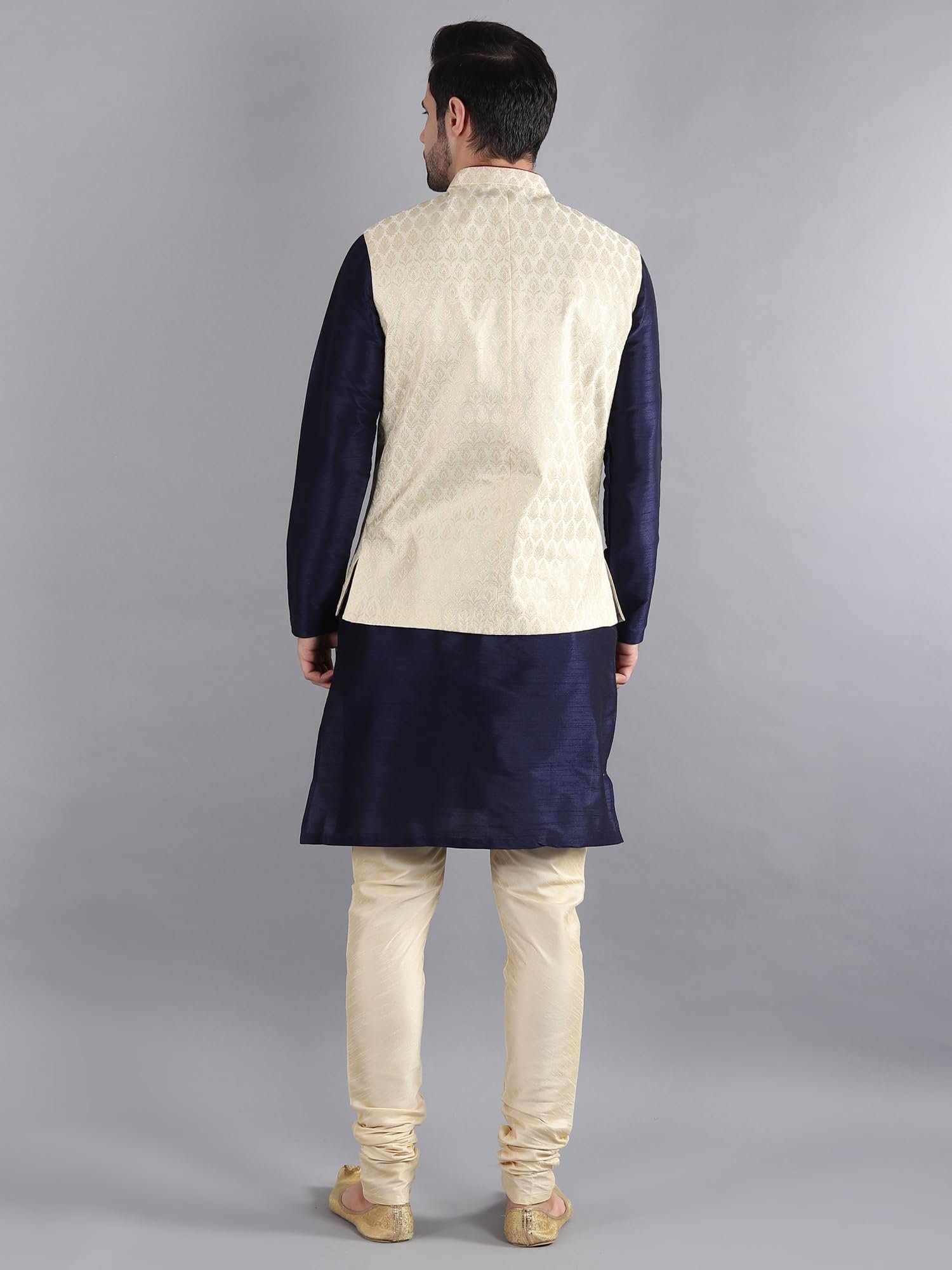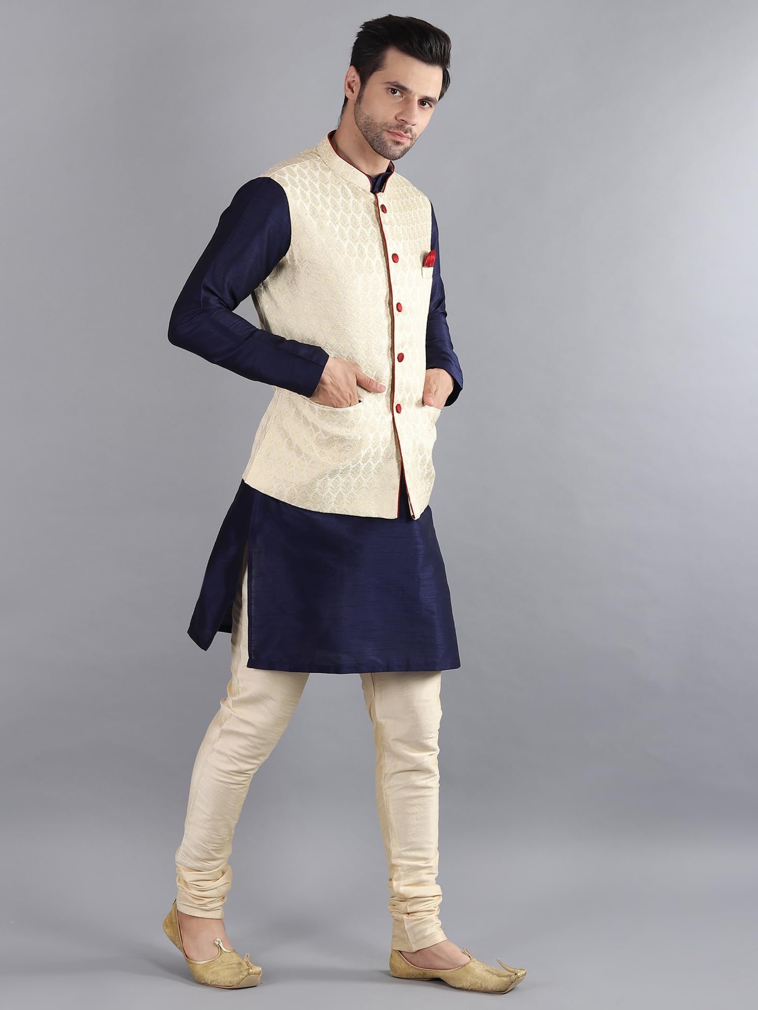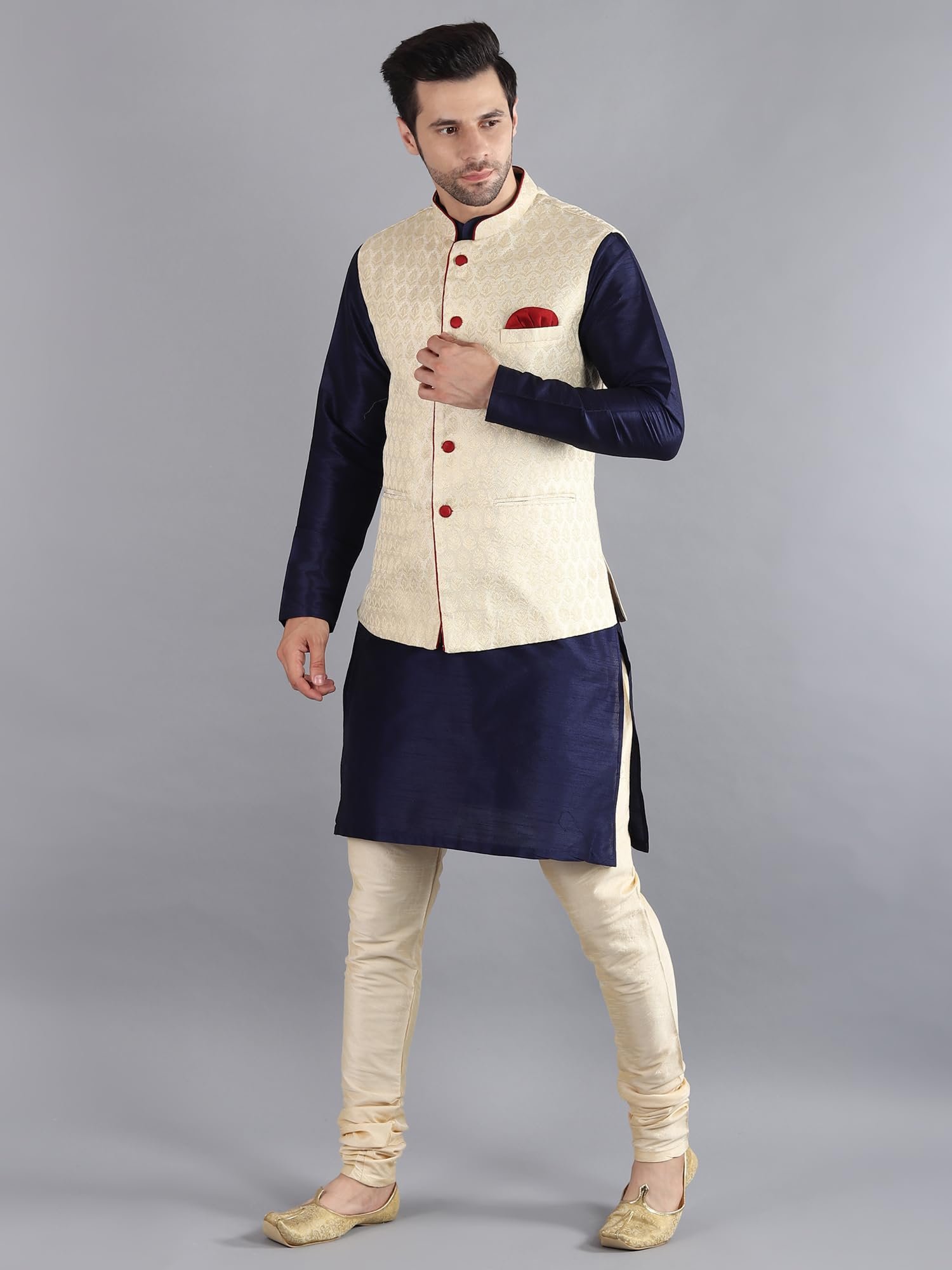 Modern Garments Blended ZORAVO Men NAVY BLUE Solid Kurta Set & Matching Chudidar with Maroon Jacket Waistcoat (46, Blue Kurta Gold Pajama Golden Jacket)
