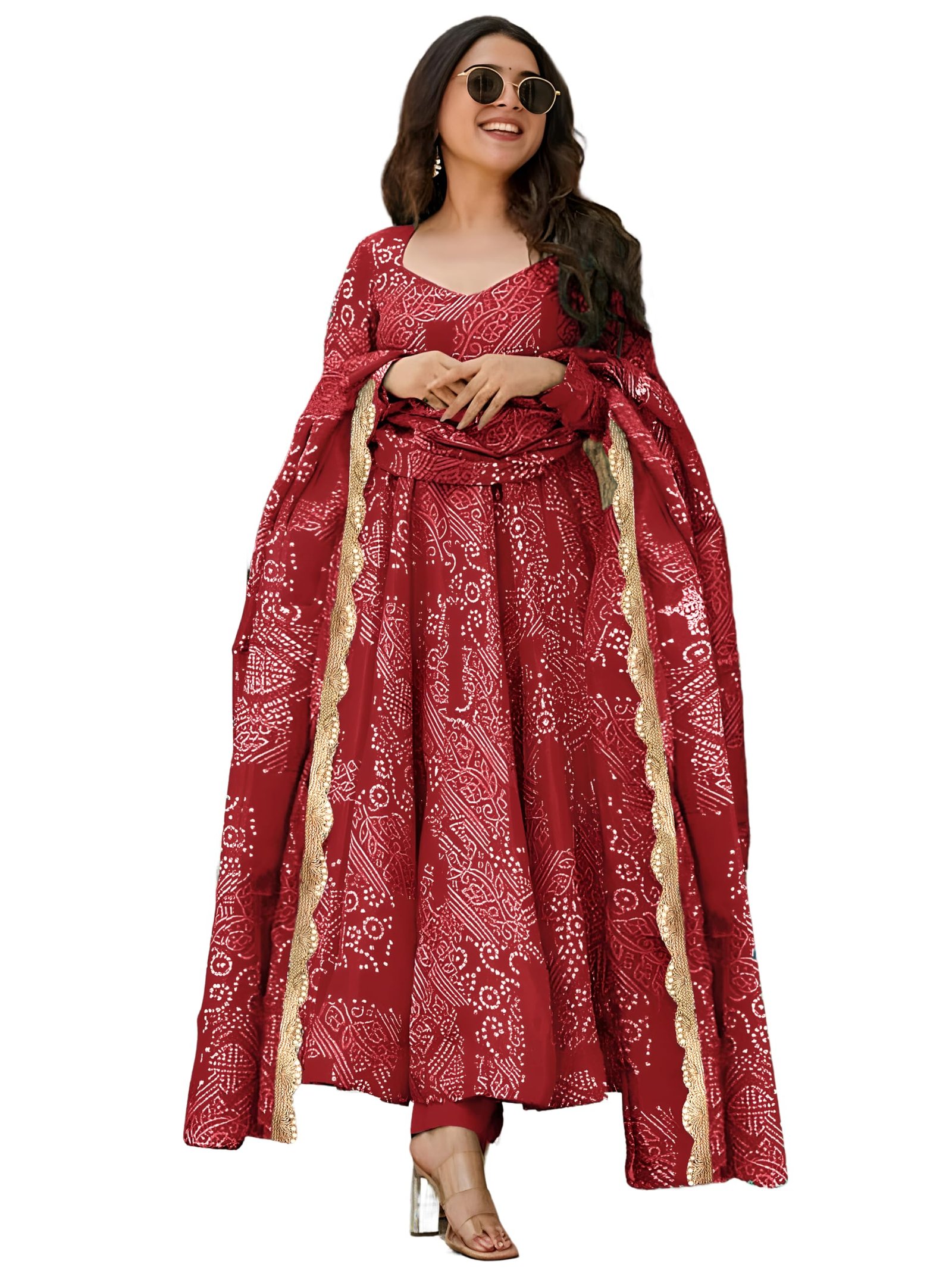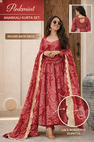 Pinkmint Women’s Bandhani Print Flared Anarkali Muslin Kurta Set with Pant & Stylish Dupatta Ethnic Long Sleeve Dress Suit Set
