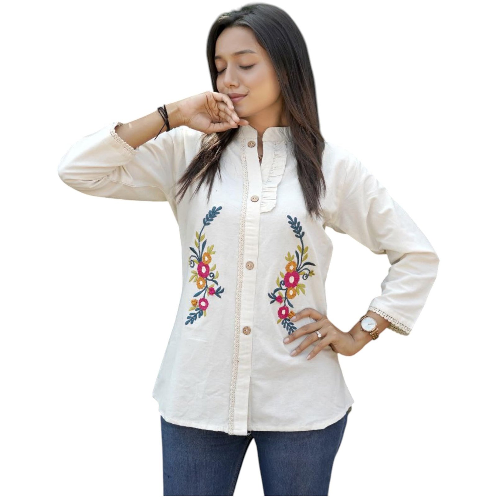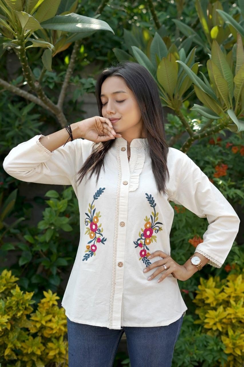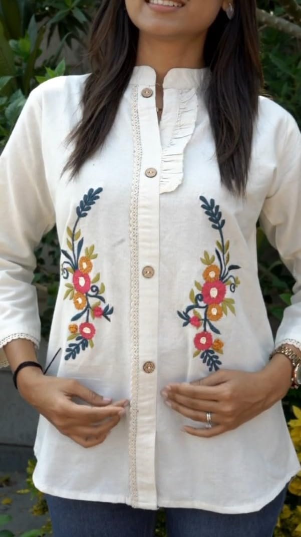 <p><b>Brand:</b> RIEKA</p><p><b>Color:</b> CREAM</p><p><b>Features:</b> <ul><li>Cream white women?s shirt featuring detailed multicolor floral embroidery placed symmetrically on the front panel</li><li>Designed with a mandarin collar neckline and button down front for a clean and structured look</li><li>Made from breathable cotton fabric suitable for daily wear and extended comfort</li><li>Relaxed fit silhouette with full sleeves and curved hemline for ease of movement</li><li>Suitable for styling with jeans, trousers, skirts or ethnic bottoms for casual and semi-formal use</li></ul></p><p><b>Package Dimensions:</b> 30x230x320</p><p><b>Details:</b> DescriptionThe RIEKA Women?s Cream White Embroidered Shirt is designed for everyday comfort with refined handcrafted detailing. The shirt comes in a soft, cream-white shade that creates a neutral base, allowing the colorful floral embroidery to stand out naturally. The embroidery features floral motifs with leafy patterns stitched in contrasting tones, giving the garment a balanced and elegant appearance without being overpowering. Crafted from breathable cotton fabric, this shirt feels light and comfortable against the skin, making it suitable for long hours of wear. The natural fabric helps maintain airflow, making it ideal for warm weather and daily routines. The mandarin collar neckline adds a subtle modern touch while maintaining a classic structure that works well in both casual and semi-formal settings. The button-down front ensures ease of wear and a neat finish. Full-length sleeves provide coverage and versatility, allowing the sleeves to be worn as is or rolled up, depending on preference. The relaxed fit offers comfort without restricting movement, making it suitable for different body shapes. A curved hemline enhances the overall silhouette and allows flexible styling options, whether tucked in or left untucked. This cream white embroidered cotton shirt pairs easily with denim jeans, cotton trousers, palazzos, or skirts. Its neutral base color combined with detailed embroidery makes it a functional wardrobe piece suitable for daily outings, work environments, or casual gatherings. Designed with comfort, simplicity, and thoughtful detailing, this shirt fits seamlessly into regular wear collections.</p>