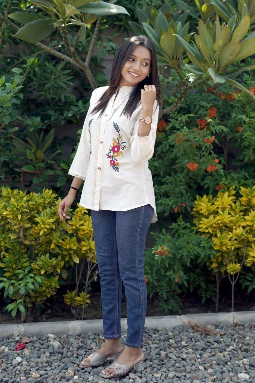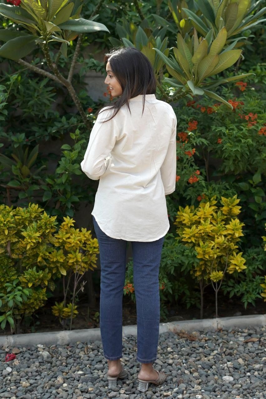RIEKA Women?s Cream White Embroidered Cotton Shirt with Floral Thread Work Mandarin Collar Button Down Relaxed Fit Casual Top (Cream-M)