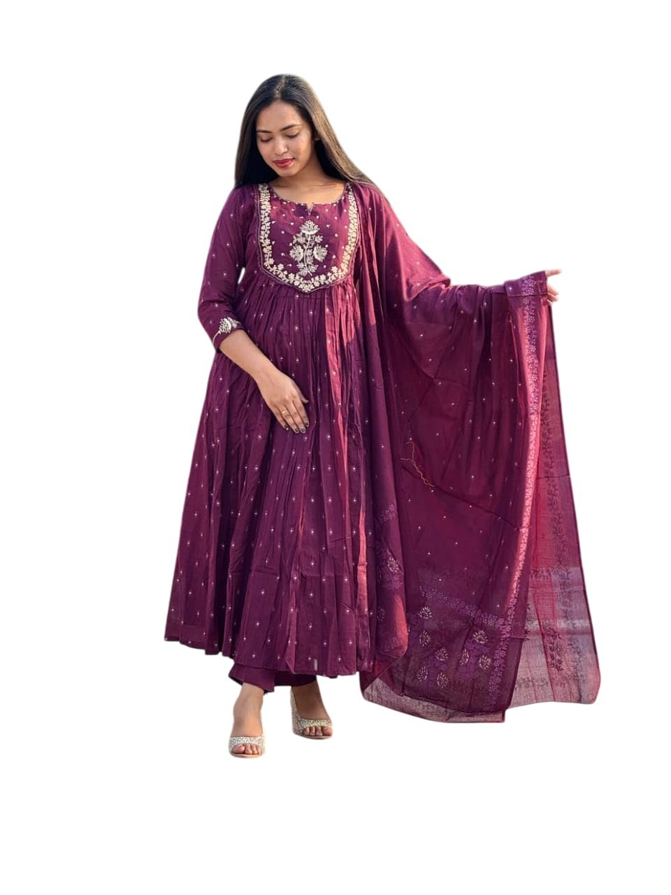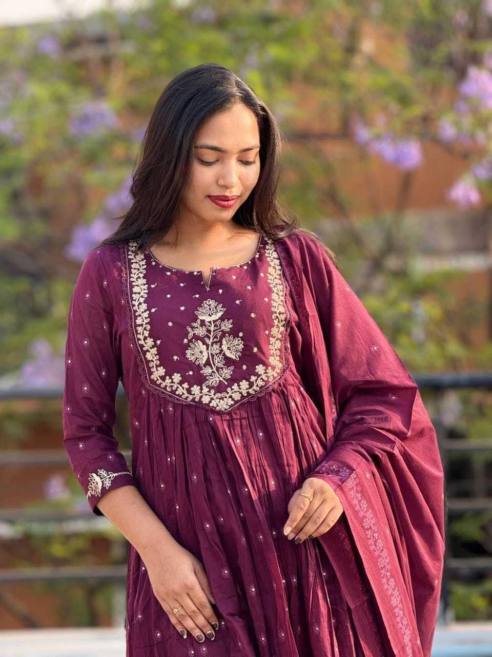RIYA ATELIER BY RIYANSHI Women’s Cotton Embroidery Anarkali Kurti and Pant with Dupatta Set (Purple-M)
