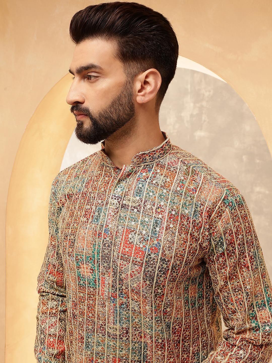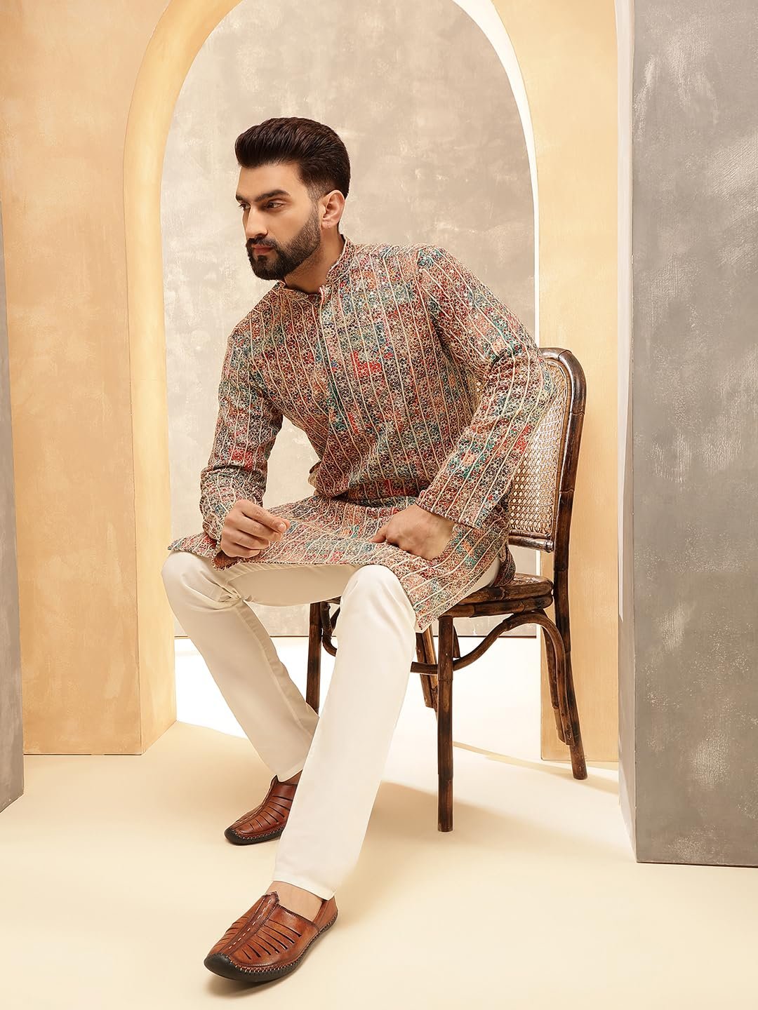 SOJANYA (Since 1958 Men’s Cotton Silk Gold Thread Floral Embroidered Kurta with White Pyjama