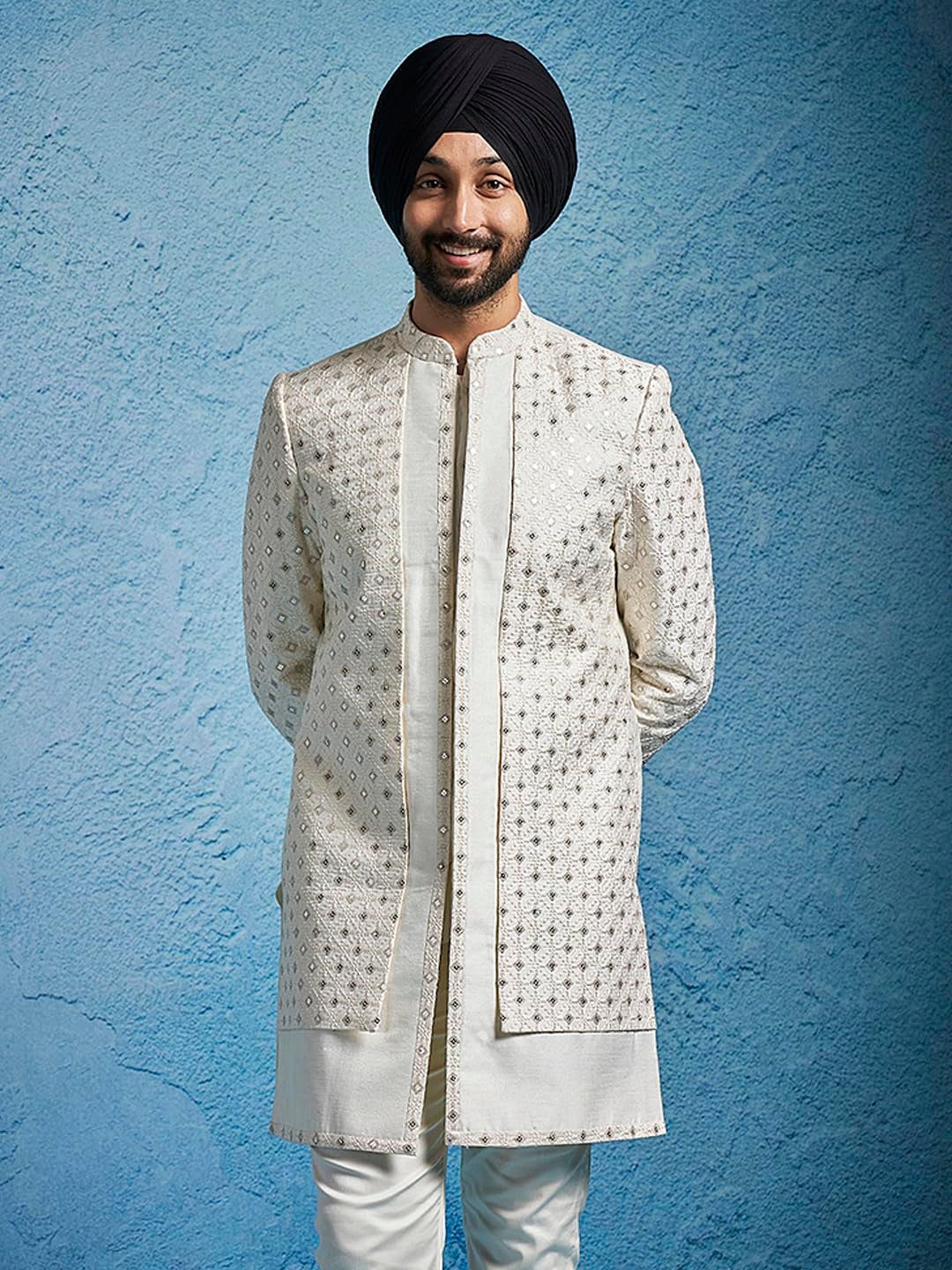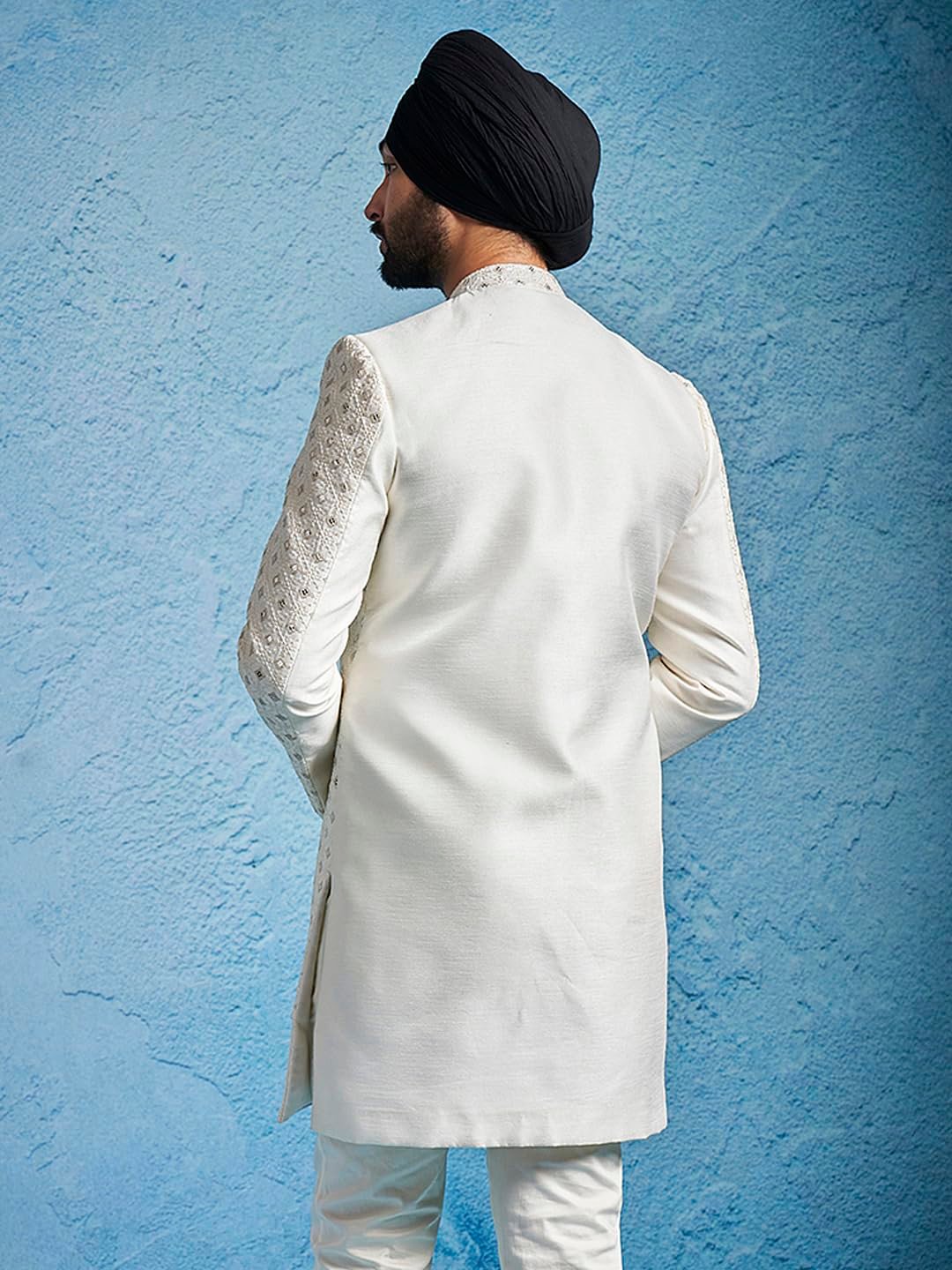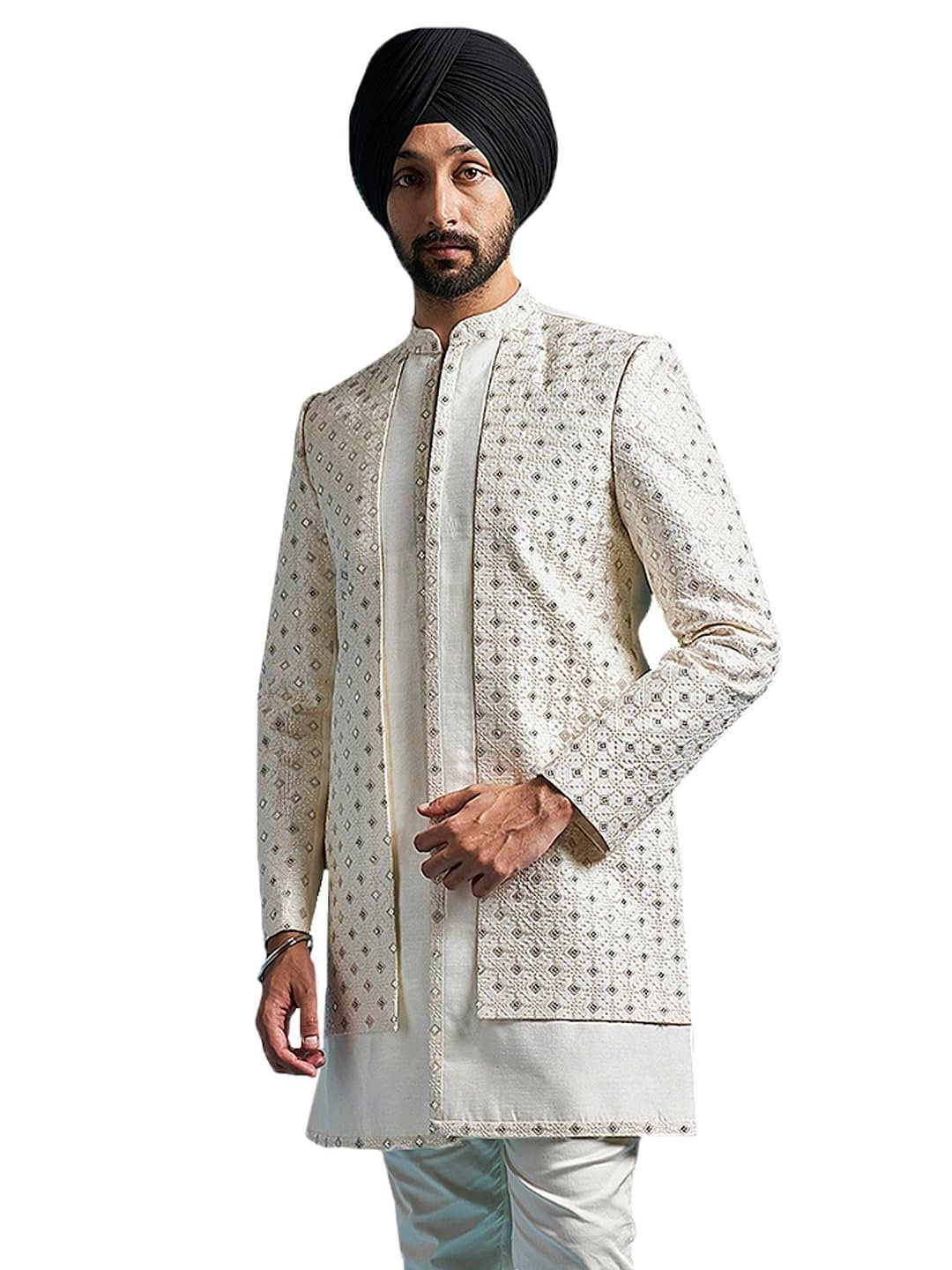 VASTRAMAY Men’s Cream Silk Blend Sherwani Only Top – Silk Blend Embroidered Sequiend Indo Western