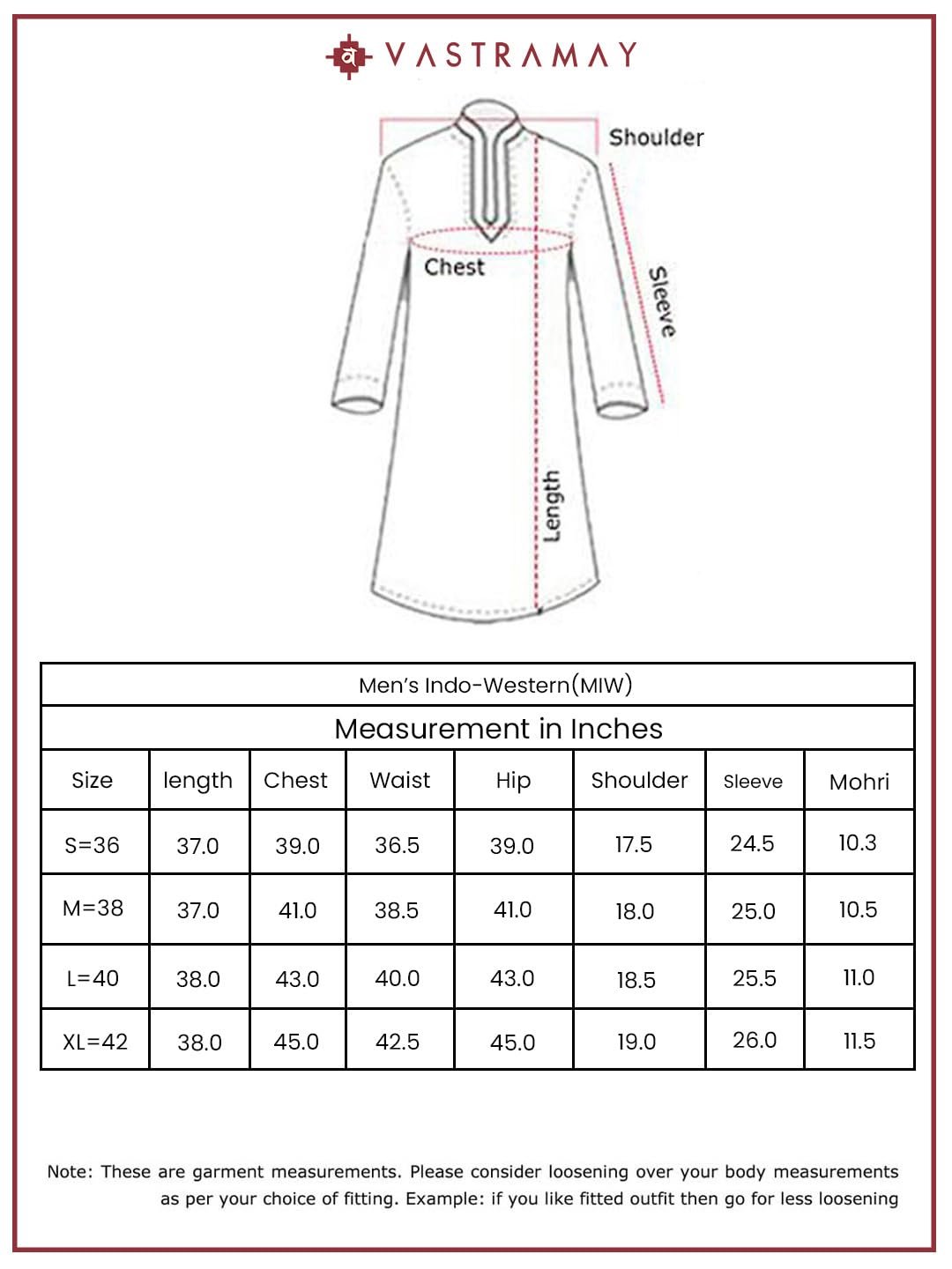 <p><b>Brand:</b> VASTRAMAY</p><p><b>Color:</b> Navy Blue</p><p><b>Features:</b> <ul><li>Fabric: Silk Blend | Contents: a Silk Blend Jacquard Indo Western for Men.</li><li>Medium length and Regular Fit. Our Kurta fitting is usually slightly relaxed compared to a Regular Shirt's fitting. Select your Kurta size based on your chest dimension. Note: if one has a heavier abdomen compared to chest then he should select one size bigger kurta.</li><li>All our kurtas have five inches loosening over the body measurement. So if your chest round measurement is 38 inches then you should go for a 38 (Medium) size Kurta which will have a garment ready chest measurement of 43 inches. We offer six sizes - Small = 36 (Chest - 41), Medium = 38 (Chest - 43), Large = 40 (Chest - 45), X- Large = 42 (Chest - 47), XX - Large = 44 (Chest - 49) and XXX - Large = 46 (Chest - 51).</li><li>Suitable for: Party, Weddings, Regular Wear, Celebrations, Occasions, Festivals, Lohri, Pongal, Makar Sakranti, Baisakhi, Holi, Eid, Raksha Bandhan, Dussehra, Diwali, Navratri, Pooja, Christmas, Onam, Ganesh Chaturthi, Janmasthmi and Gifts for Mens.</li><li>Wash Care Instructions: Dry Clean preferably or cold light wash | Disclaimer: We have made a consistent effort to make the colors and finishes similar to the image of the products you see on screen. However, the actual product and the images on the website</li></ul></p><p><b>Package Dimensions:</b> 84x612x760</p><p><b>Details:</b> DescriptionSilk Blend Jacquard knee length regular sherwani, has a mandarin collar, long sleeves,Wear it in parties,traditional functions and festive occasion.</p>