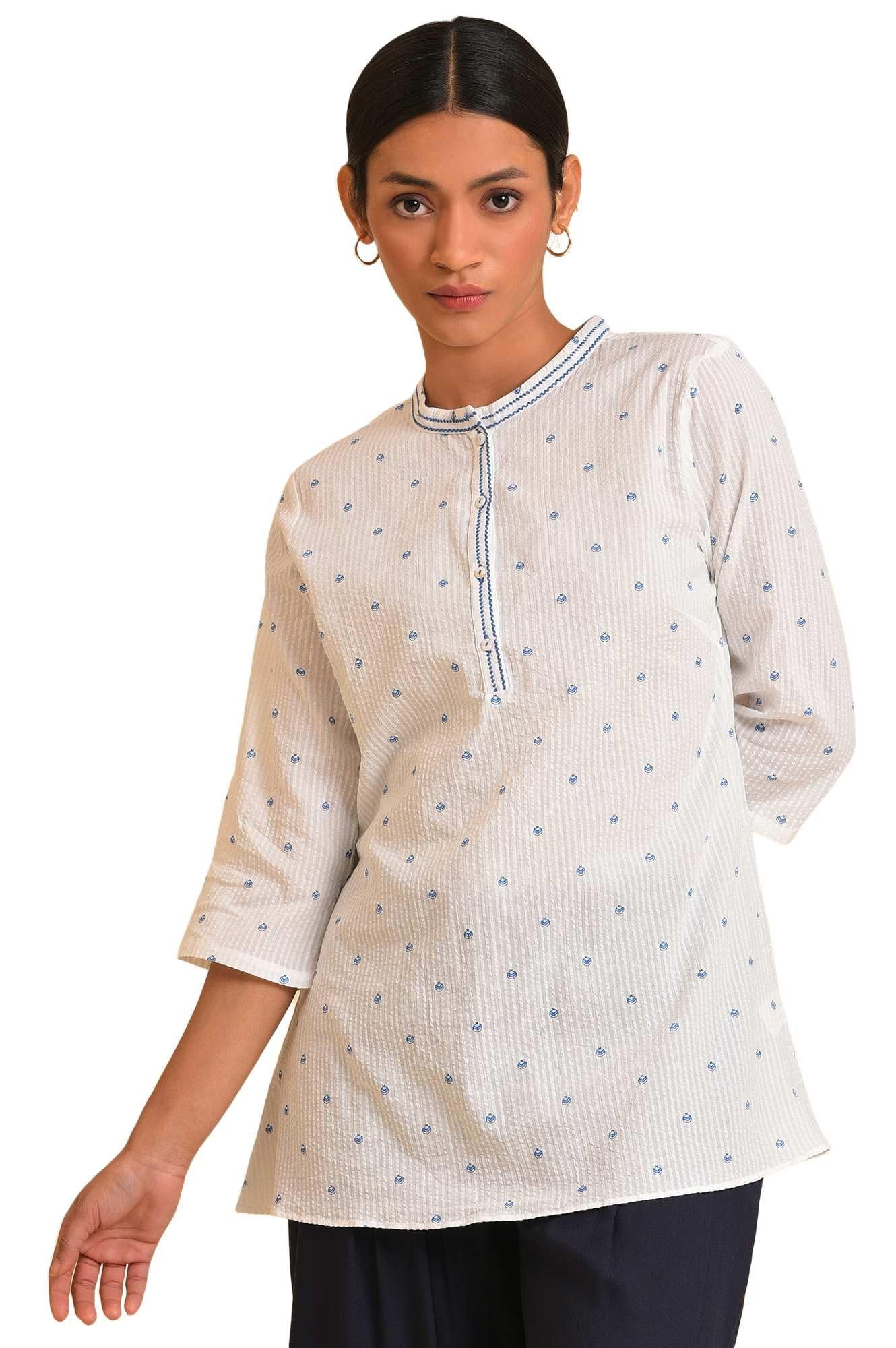 <p><b>Brand:</b> W for Woman</p><p><b>Color:</b> WHITE</p><p><b>Features:</b> <ul><li>This ecru tunic from W is a testament to comfort and style. Made from 100% cotton, it features a textured pattern that adds visual interest. The tunic silhouette offers a relaxed fit, perfect for various body types.</li><li>Fabric: 100% cotton for maximum breathability and comfort</li><li>Wash care: Machine wash cold. Tumble dry low. Iron on medium heat if needed.</li><li>Occasion: Ideal for casual outings, beach days, or lounging at home</li><li>Style suggestion: Pair this tunic with leggings and sandals for a effortlessly chic look</li></ul></p><p><b>Package Dimensions:</b> 44x271x120</p><p><b>Details:</b> DescriptionCrafted in premium seer sucker fabric, this classy and stylish western top is a must-have for your wardrobe. This top has mandarin collar and half placket, and it is adorned with small blue booti print all over.</p>