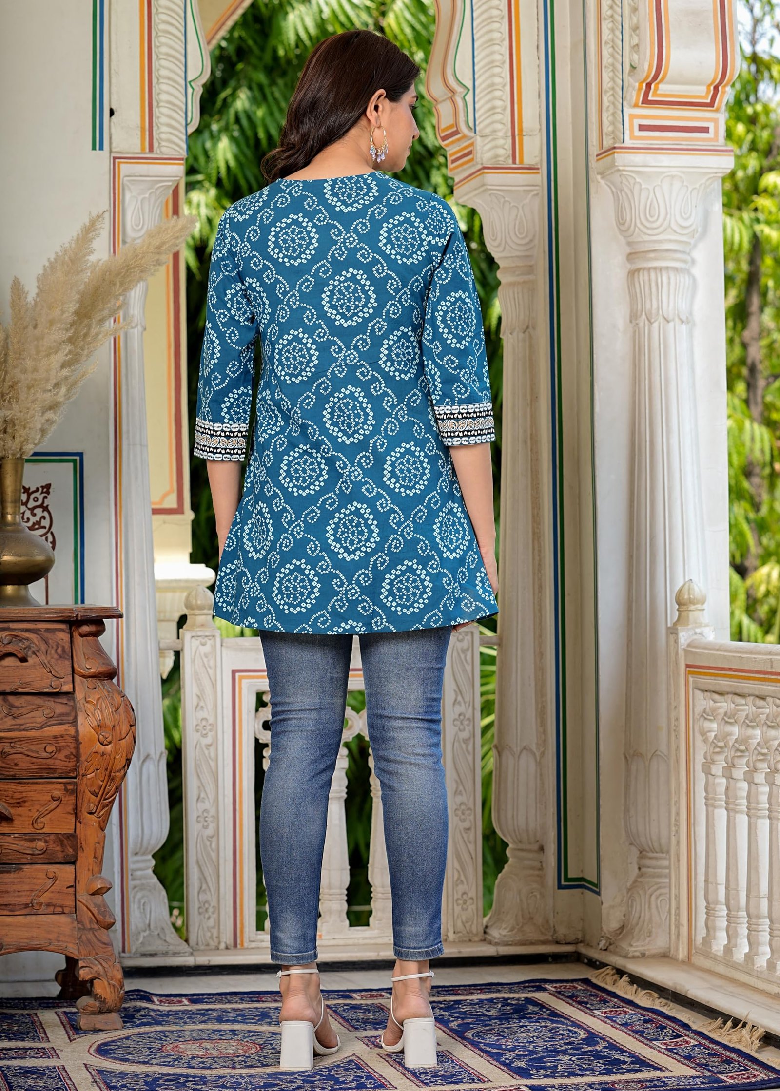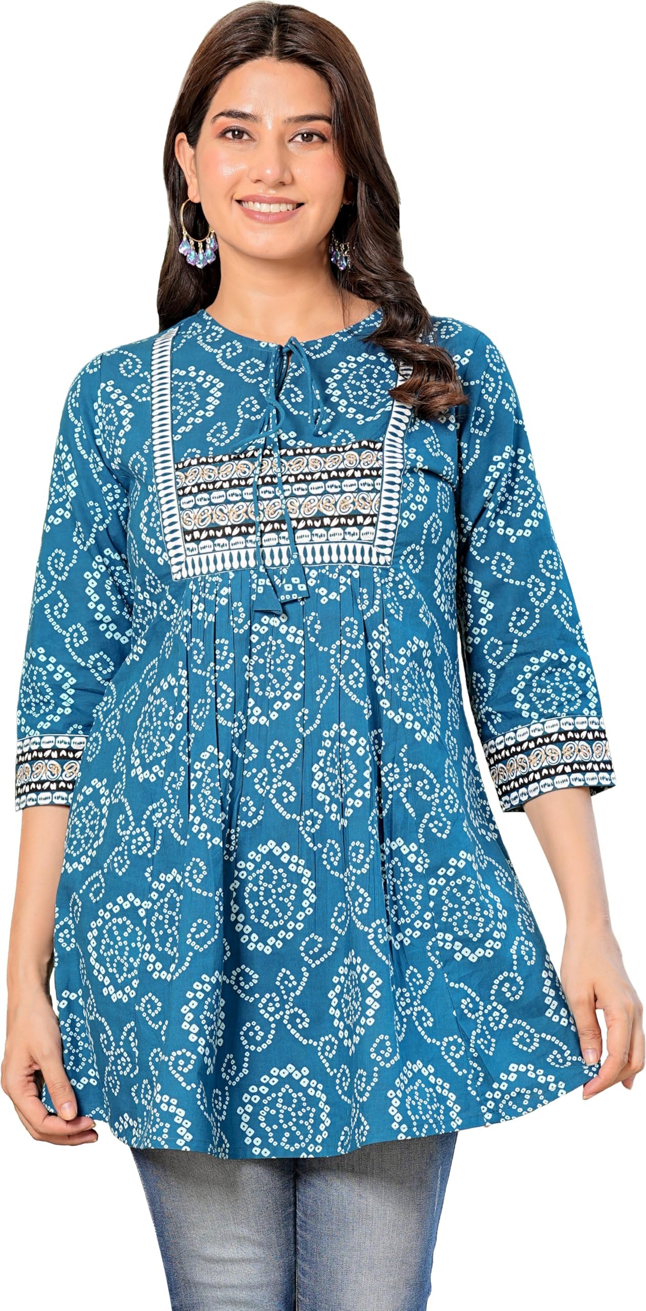 Yash Gallery Women’s Cotton Blend Bandhani Straight Regular Fit Short Kurta Tops for Women (XXX-Large, Blue)