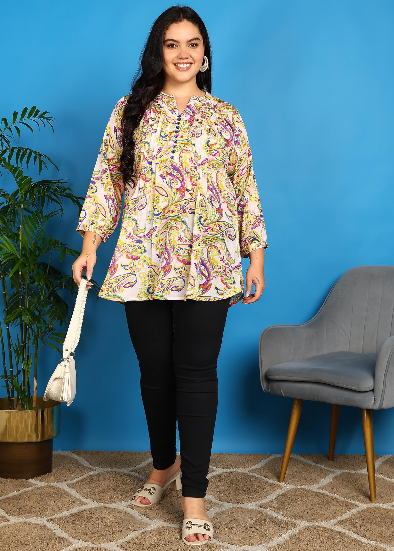 <p><b>Brand:</b> Yash Gallery</p><p><b>Color:</b> Multicolour</p><p><b>Features:</b> <ul><li>Soft & Breathable Chiffon: Lightweight, smooth hand-feel that drapes well and stays comfortable through the day.</li><li>Flattering Fit: Relaxed A-line silhouette with hip-covering length; front pleat/pintucks create gentle ease and tummy-skimming fall.</li><li>Chic Design Details: Multicolor paisley print on a light base, round neck with small V-notch, short button placket, 3/4 sleeves and neat top-stitching.</li><li>Versatile Styling: Works with leggings, jeans or palazzos—perfect for office, brunch, travel and daily wear.</li><li>Care Instructions: Machine wash gentle with like colors; do not bleach; line dry in shade; warm iron on reverse if needed.</li></ul></p><p><b>Package Dimensions:</b> 53x348x180</p><p><b>Details:</b> DescriptionRefresh your ethnic wardrobe with this stunning Women’s Polyester Marble Print Kurti from Yash Gallery. Crafted in soft and breathable polyester, this kurti is designed with delicate pintuck pleats on the front panel, accentuated with matching fabric-covered buttons that enhance its elegant charm. The soothing pastel blue base with abstract marble patterns in yellow and green creates a trendy and graceful appeal. The kurti comes with a stylish mandarin collar neckline, 3/4th sleeves, and a flared hem that provides ease of movement and a flattering fit. Whether you’re dressing up for a day at the office, a casual outing, or festive gatherings, this piece offers the perfect blend of comfort and style. Pair it effortlessly with leggings, jeggings, or palazzo pants to complete your look. Choose Yash Gallery for authentic ethnic fashion with a modern twist – where comfort meets elegance.</p>