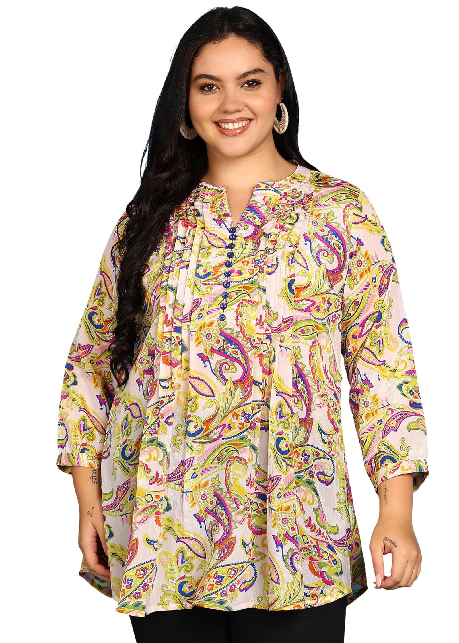 Yash Gallery Women’s Multicolor Paisley Print Chiffon Tunic Top with Pintucks & Button Placket | Round Neck with Notch, 3/4 Sleeves | A-Line Short Kurti